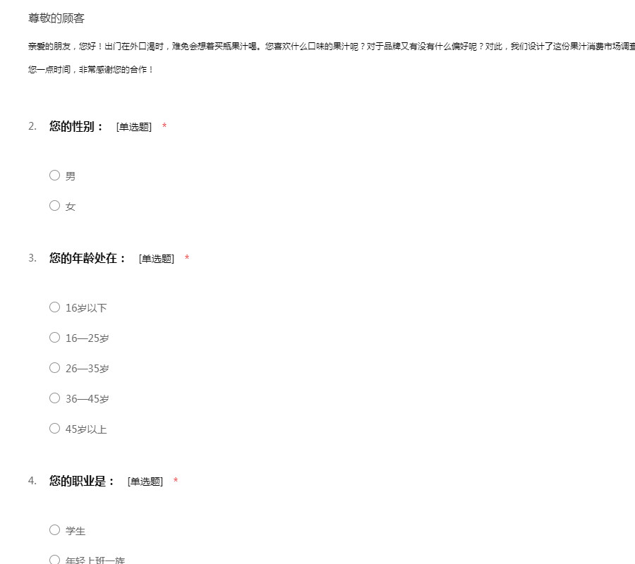 亲爱的朋友,您好!出门在外口渴时,难免会想着买瓶果汁喝。您喜欢什么口味的果汁呢?对于品牌又有没有什么偏好呢?对此,我们设计了这份果汁消费市场调查问卷,希望您能够帮助我们完成这份问卷。占用您一点时间,非常感谢您的合作!