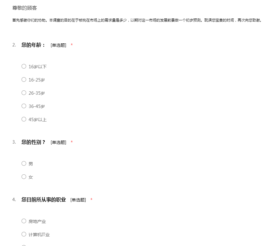 首先感谢你们的协助。本调查的目的在于核桃在市场上的需求量是多少,以期对这一市场的发展前景做一个初步预测。耽误您宝贵的时间,再次向您致谢。
