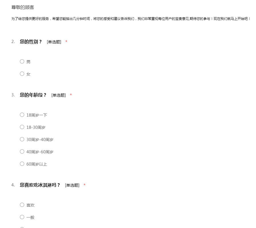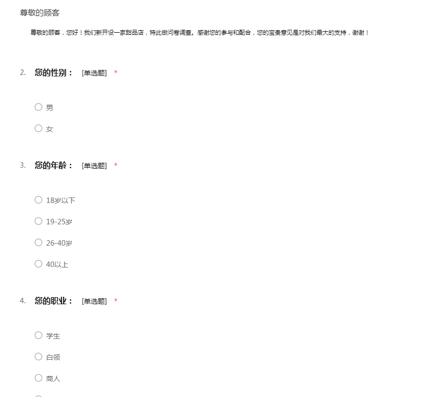 尊敬的顾客,您好!我们新开设一家甜品店,特此做问卷调查。感谢您的参与和配合,您的宝贵意见是对我们最大的支持,谢谢!