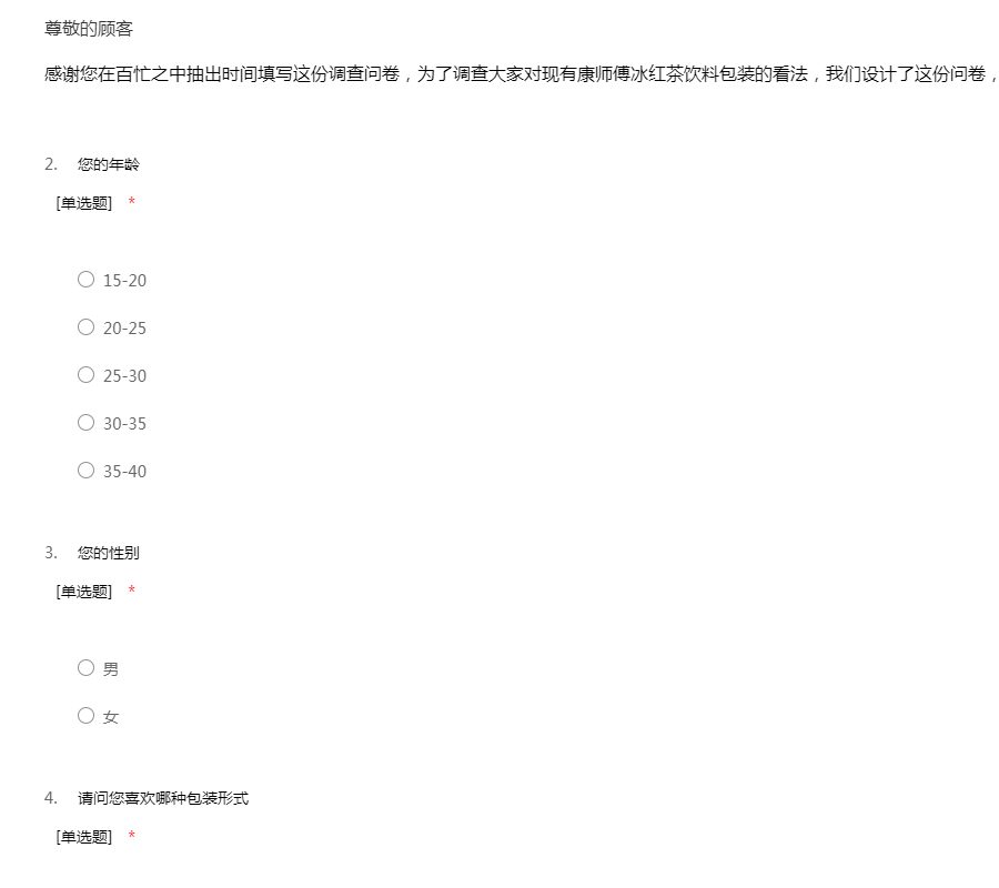 感谢您在百忙之中抽出时间填写这份调查问卷,为了调查大家对现有康师傅冰红茶饮料包装的看法,我们设计了这份问卷,希望您能认真填写。