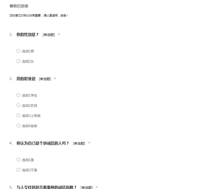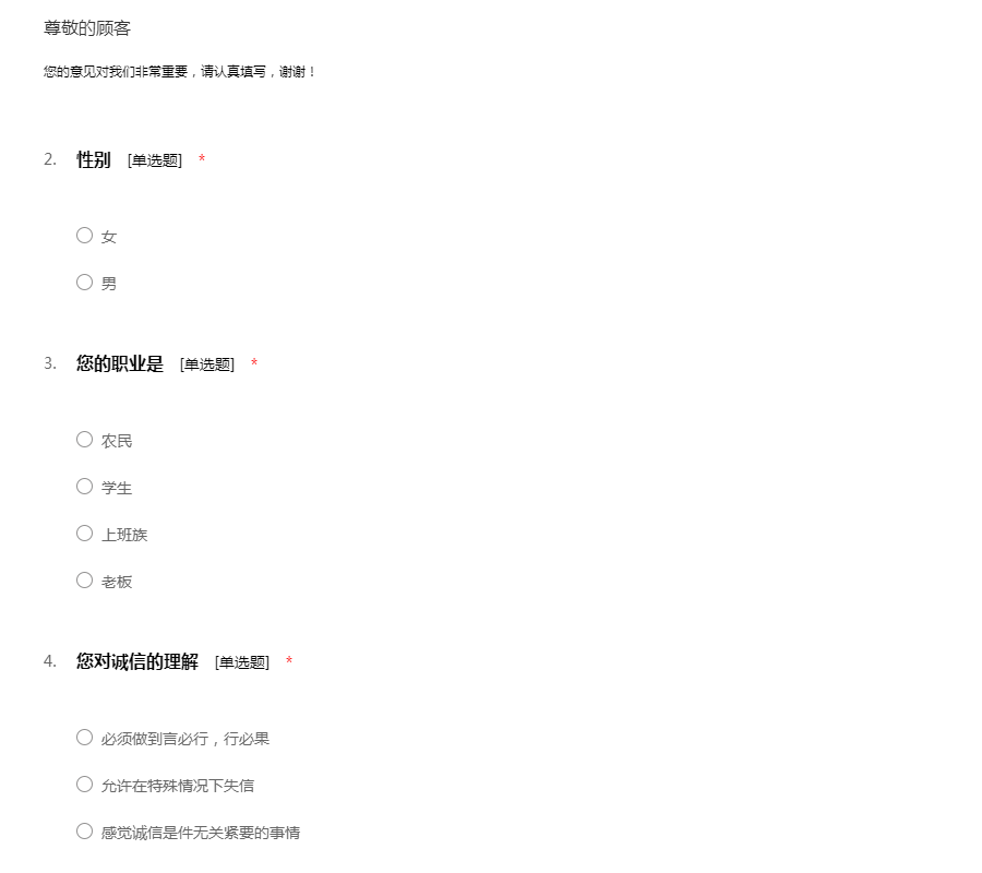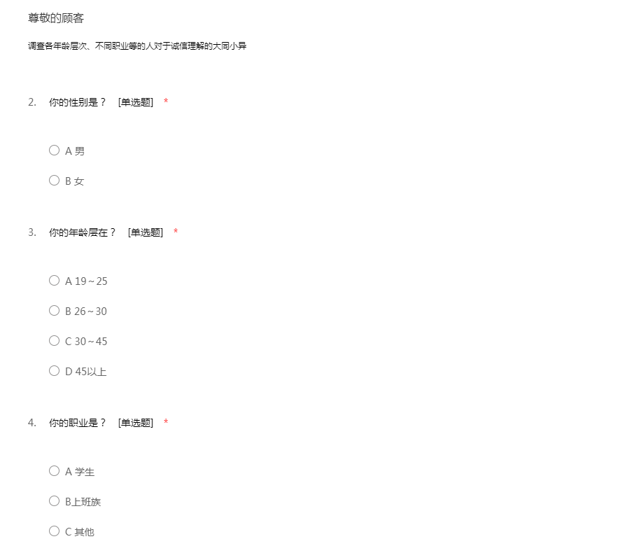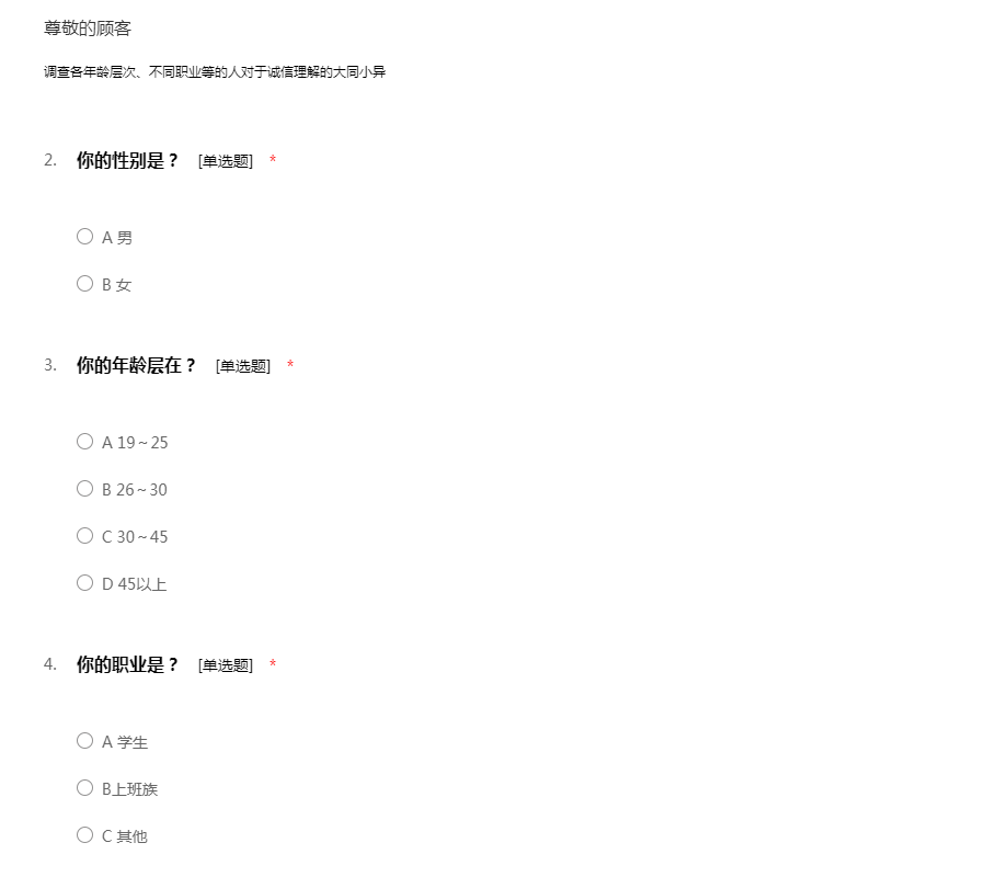 本次问卷以“诚信“为主题,多方位了解不同阶层的人对诚信的认识度并进一步推广诚信精神。希望大家抽出一点时间完成问卷,谢谢配合。