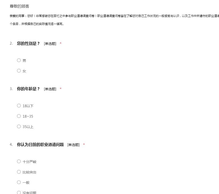 亲爱的同事:您好!非常感谢您在百忙之中参与职业道德调查问卷!职业道德调查问卷旨在了解您对自己工作状况的一般感受与认识,以及工作中所遵守的职业道德及行业规范的认知情况。请您仔细地阅读下列每个条目,并根据自己的实际情况逐一填写。