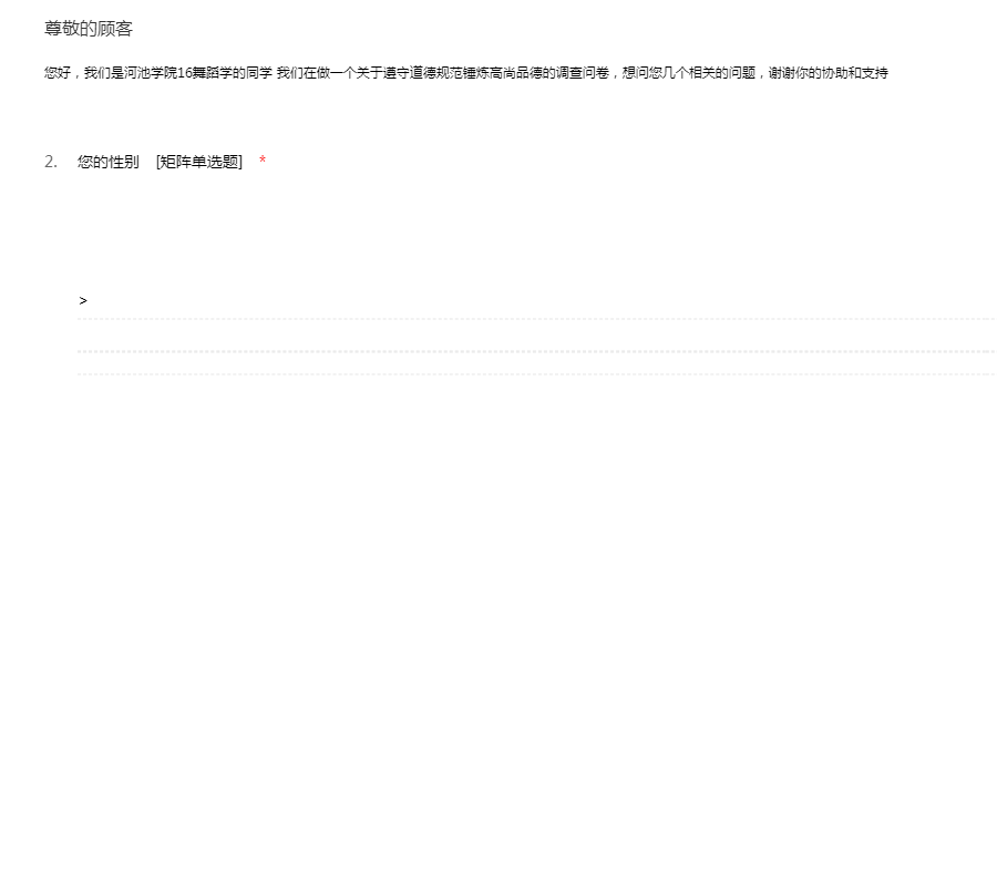 您好,我们是河池学院16舞蹈学的同学 我们在做一个关于遵守道德规范锤炼高尚品德的调查问卷,想问您几个相关的问题,谢谢你的协助和支持