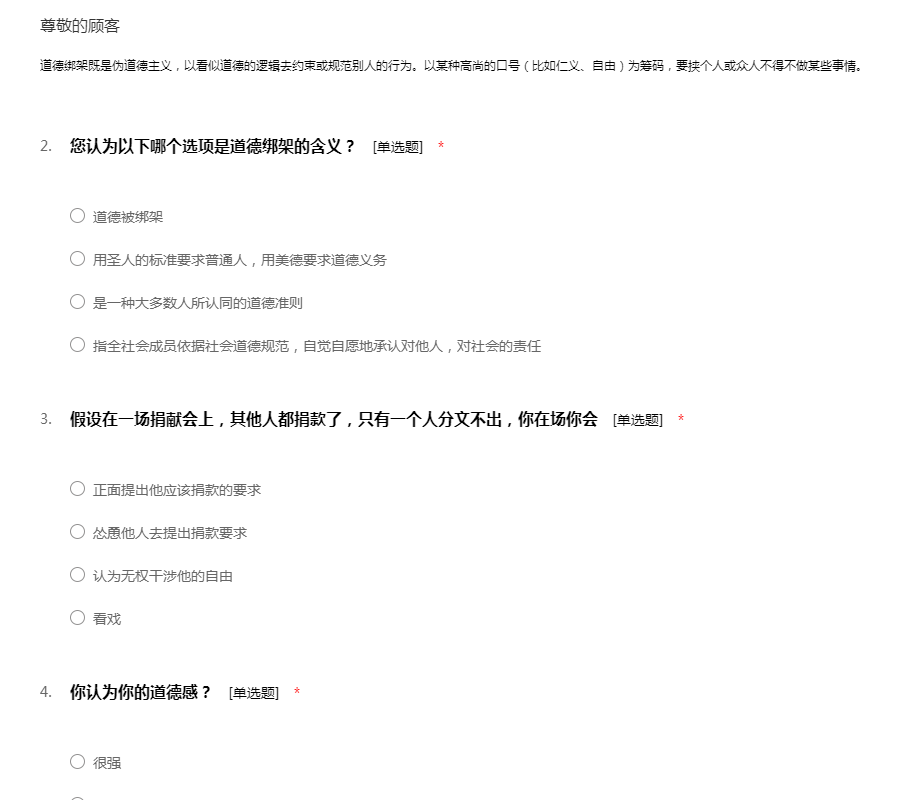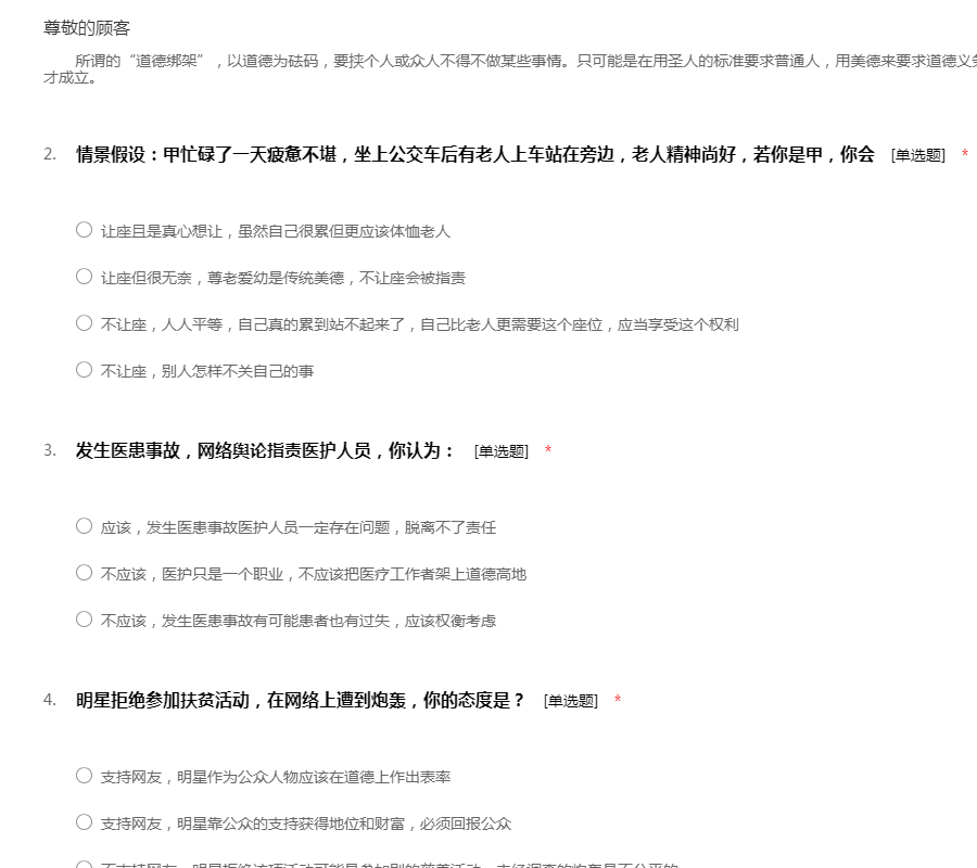 在飞快发展的当今社会,各种社会问题暴露出,我们的整个社会需要加强培养个人的道德素养。个人的道德素养直接影响着社会公德、职业道德、家庭美德、世界观和荣辱观等问题。因此,个人品德是我们社会道德建设的基础和根本。为了了解更多人的道德问题,我们设计了此问卷,希望您能如实填写!