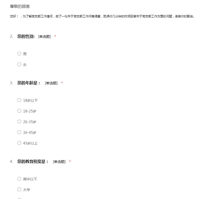 您好! ,为了解党支部工作情况,做了一份关于党支部工作问卷调查,耽误你几分钟的时间回答关于党支部工作方面的问题,谢谢你的配合。