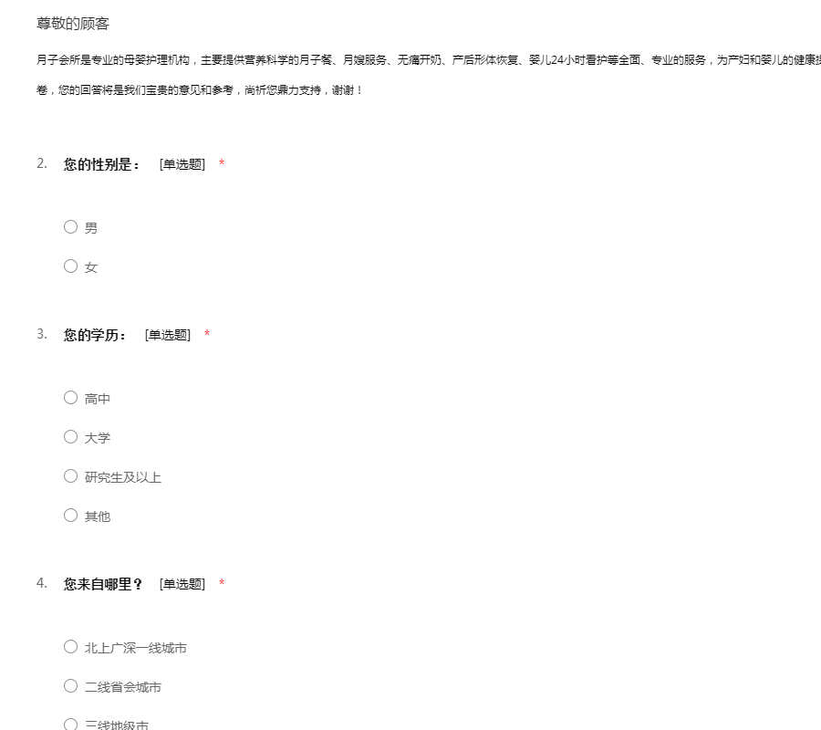 月子会所是专业的母婴护理机构,主要提供营养科学的月子餐、月嫂服务、无痛开奶、产后形体恢复、婴儿24小时看护等全面、专业的服务,为产妇和婴儿的健康提供保证。感谢您在百忙之中抽空填写本调查问卷,您的回答将是我们宝贵的意见和参考,尚祈您鼎力支持,谢谢!