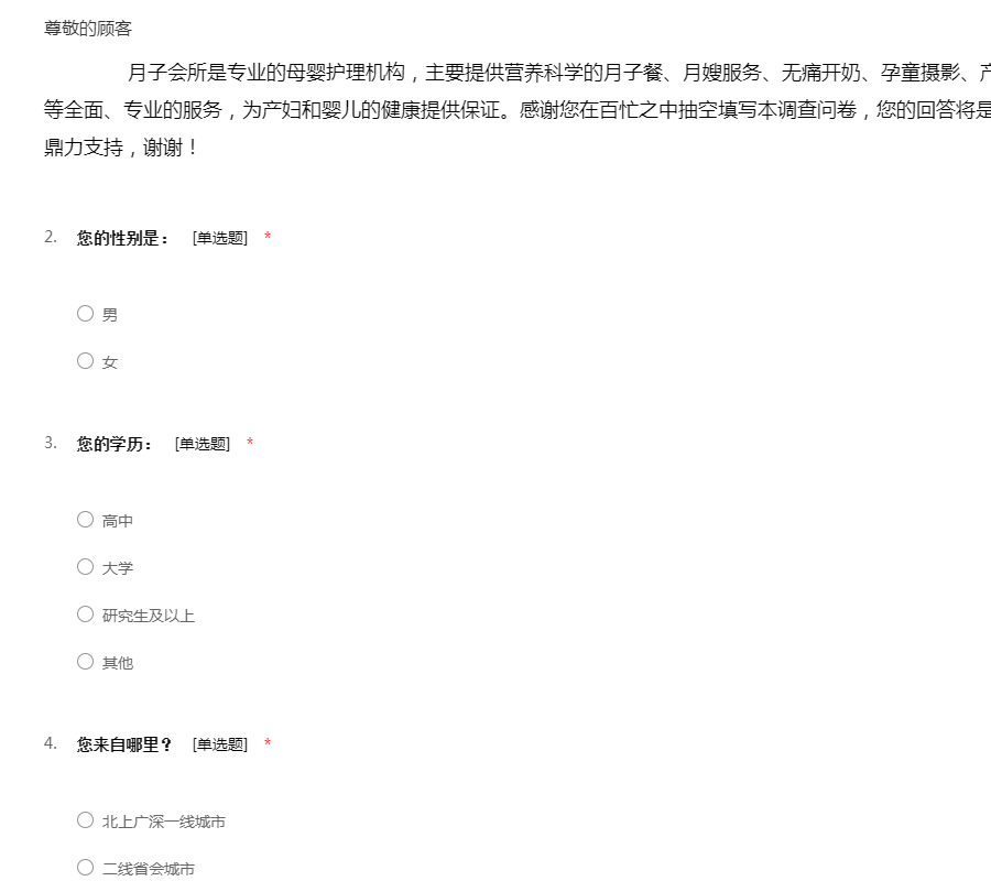 月子会所是专业的母婴护理机构,主要提供营养科学的月子餐、月嫂服务、无痛开奶、孕童摄影、产后形体恢复、婴儿24小时看护等全面、专业的服务,为产妇和婴儿的健康提供保证。感谢您在百忙之中抽空填写本调查问卷,您的回答将是我们宝贵的意见和参考,尚祈您鼎力支持,谢谢!