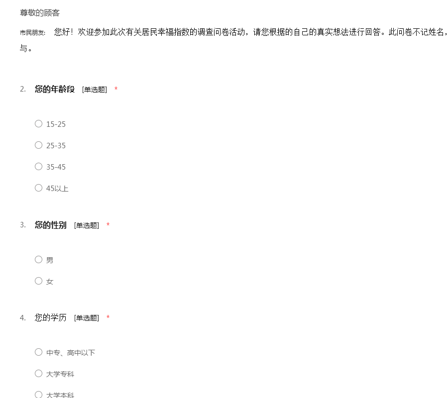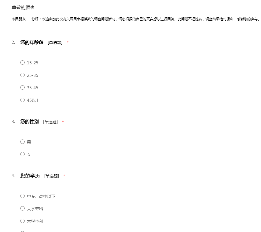 市民朋友: 您好!欢迎参加此次有关居民幸福指数的调查问卷活动,请您根据的自己的真实想法进行回答。此问卷不记姓名,调查结果绝对保密,感谢您的参与。