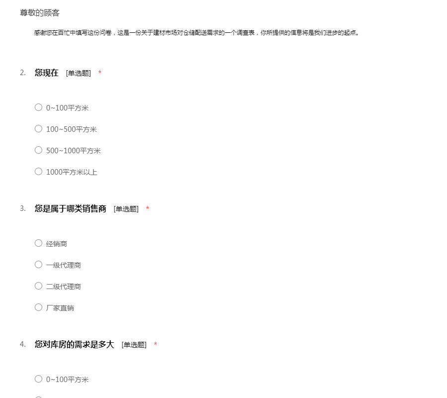 感谢您在百忙中填写这份问卷,这是一份关于建材市场对仓储配送需求的一个调查表,你所提供的信息将是我们进步的起点。