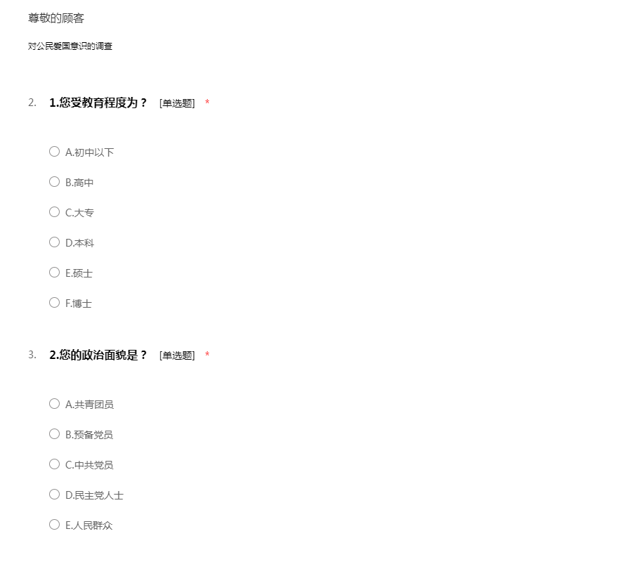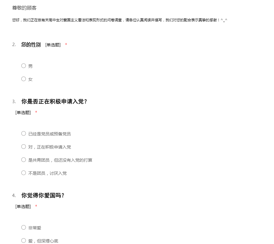 我们正在做有关爱国主义思想状况的问卷调查,感谢您从百忙中抽出时间来支持我们!请如实填写问卷。