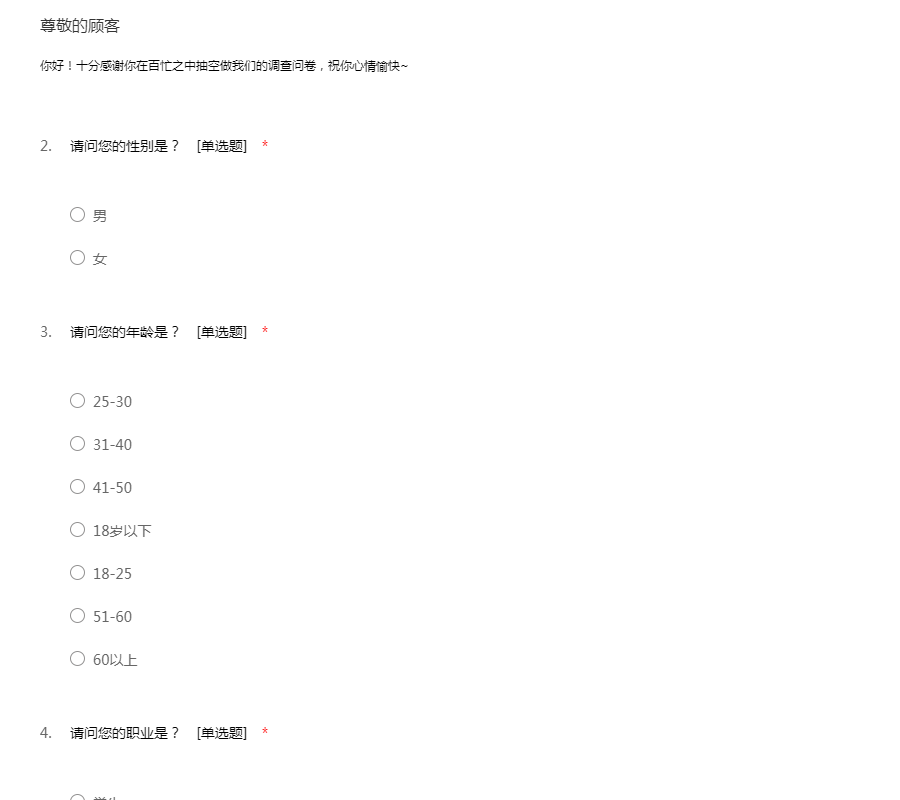 你好!十分感谢你在百忙之中抽空做我们的调查问卷,祝你心情愉快~