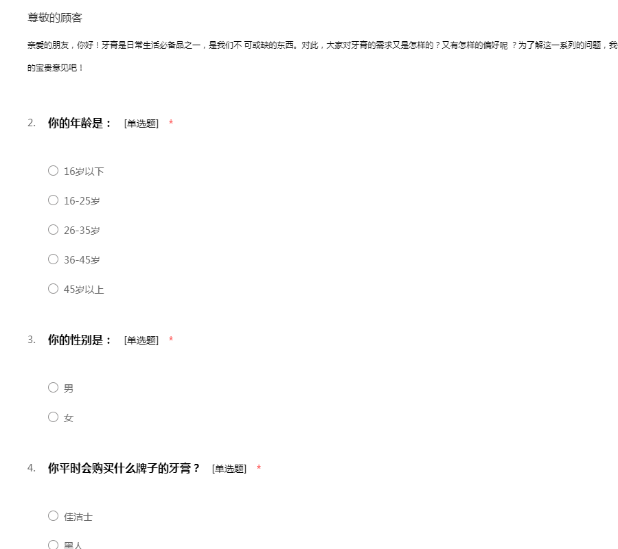 亲爱的朋友,你好!牙膏是日常生活必备品之一,是我们不 可或缺的东西。对此,大家对牙膏的需求又是怎样的?又有怎样的偏好呢 ?为了解这一系列的问题,我们设计了这份问卷。快来填写这份问卷,留 下你的宝贵意见吧!
