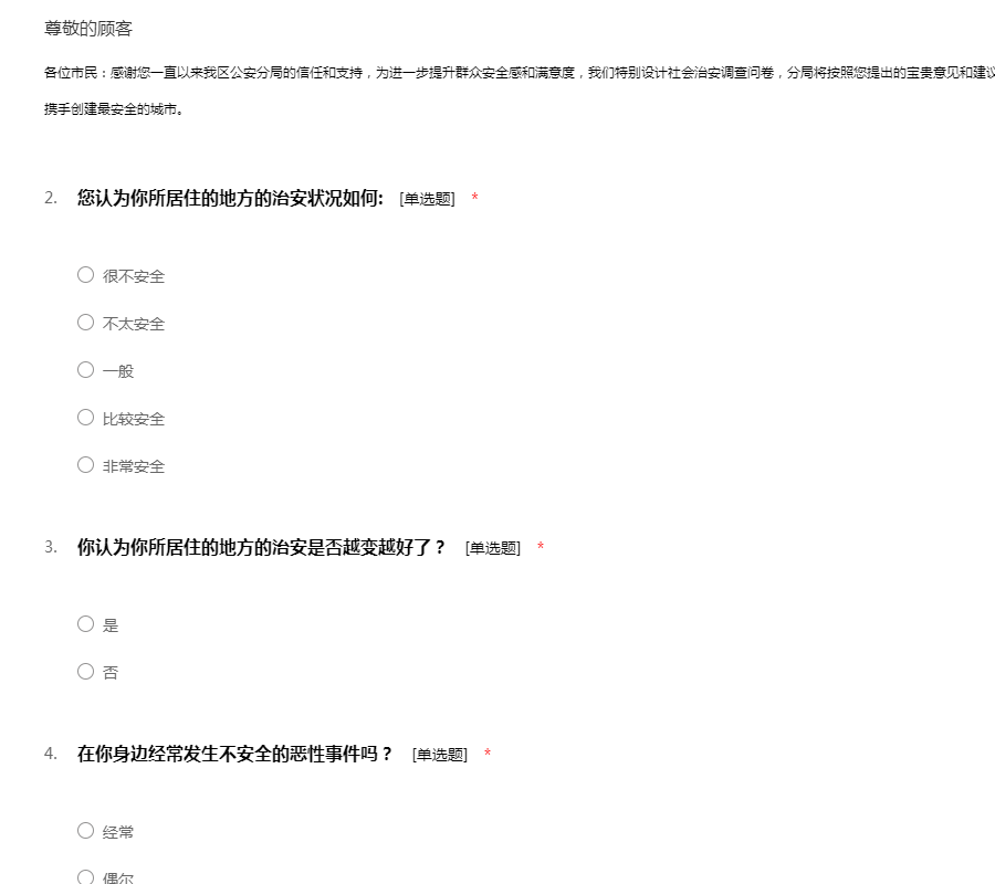 各位市民:感谢您一直以来我区公安分局的信任和支持,为进一步提升群众安全感和满意度,我们特别设计社会治安调查问卷,分局将按照您提出的宝贵意见和建议,不断改进提升公安管理和服务水平,和您一起携手创建最安全的城市。