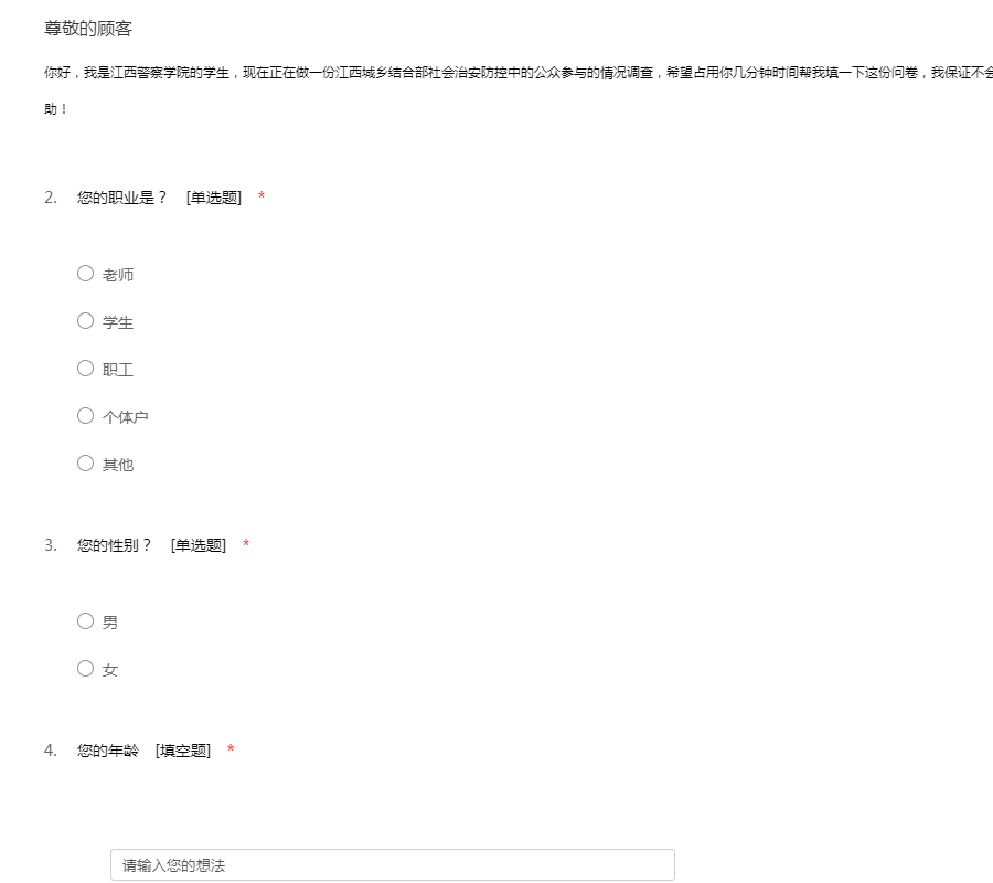 你好,我是江西警察学院的学生,现在正在做一份江西城乡结合部社会治安防控中的公众参与的情况调查,希望占用你几分钟时间帮我填一下这份问卷,我保证不会以任何形式泄露问卷上的任何信息。感谢你的帮助!