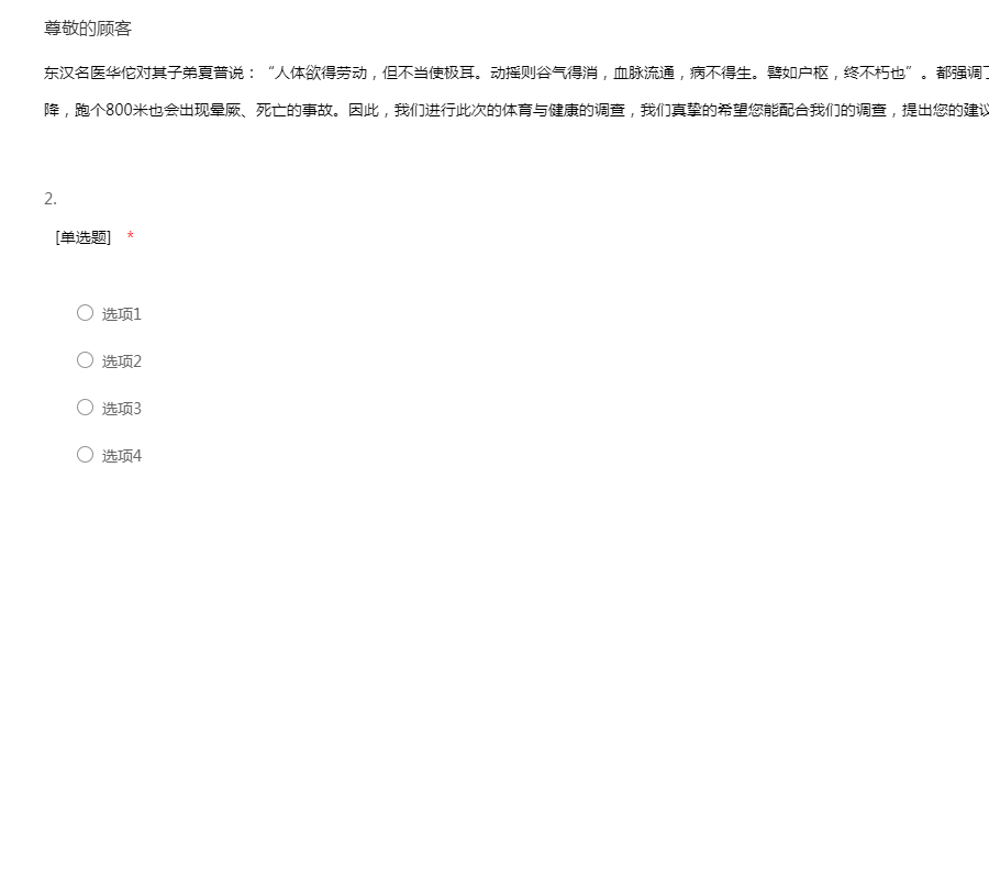 尊敬的女士/先生: 这是一份探讨“休闲体育活动调查”的问卷,现就不同人们休闲体育活动进行调研,您的宝贵数据将成为我们专业的研究对象,衷心感谢您的合作!本调查问卷所收集的数据仅用于数据分析,不做其他用途,再次感谢您的支持!