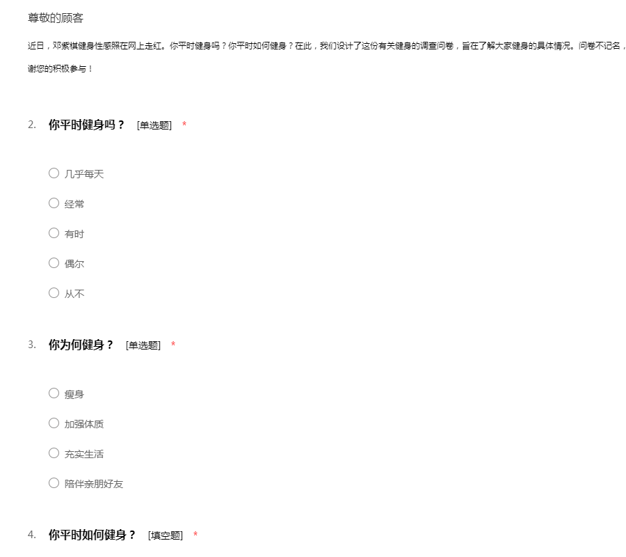近日,邓紫棋健身性感照在网上走红。你平时健身吗?你平时如何健身?在此,我们设计了这份有关健身的调查问卷,旨在了解大家健身的具体情况。问卷不记名,请不必担心。数据结果仅用于调查研究之用,感谢您的积极参与!