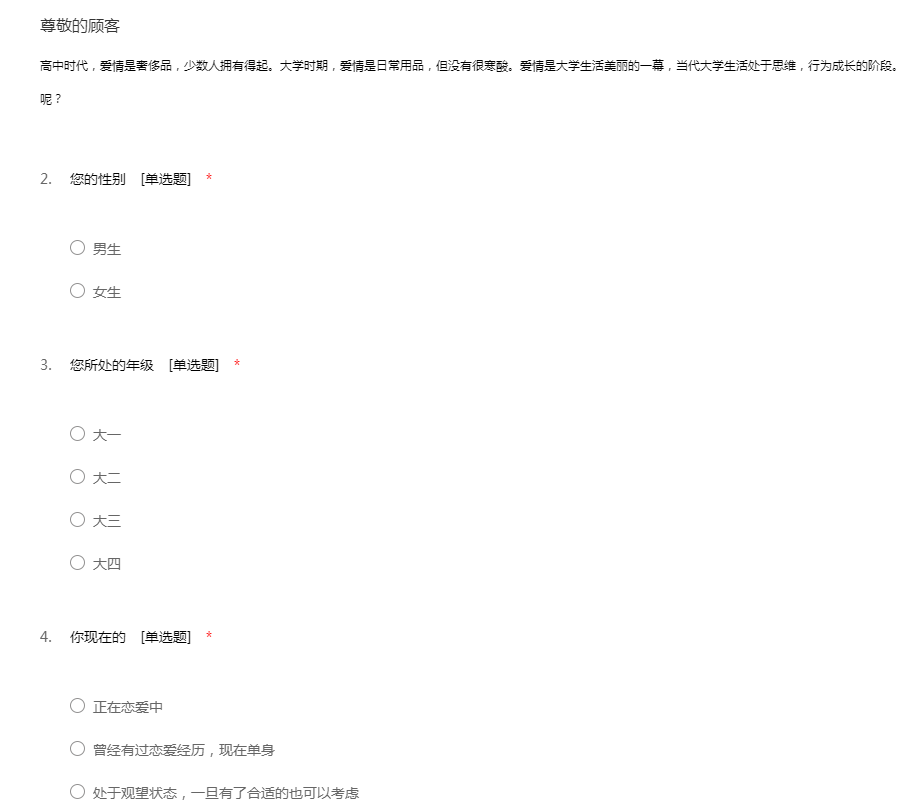 亲爱的同学们:你们好!我们通过一些调查研究了解到,大学时期的婚恋观可以深刻影响人的一生的恋爱和婚姻;然而,因为我们年龄尚浅,涉世不深,缺乏深入了解以及正确判断一个人的经验,所以,在大学阶段及早树立正确的婚恋观非常关键。针对上述实情,我们特意做了这份调查问卷,了解大学生的恋爱问题以及影响因素。本调查采取匿名制,只会耽误您几分钟时间,请根据实情认真填写,非常感谢您的支持与配合!