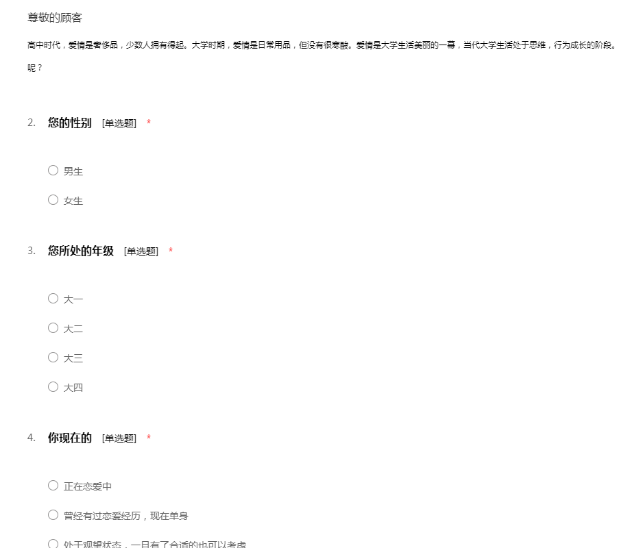 首先,请原谅我们占用了您的宝贵时间。我们为了解大学生的婚恋观,做出此调查。本次调查采用匿名制,请根据您的实际想法认真填写,希望大家能够支持,谢谢!