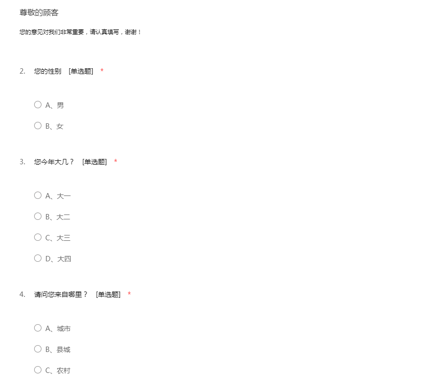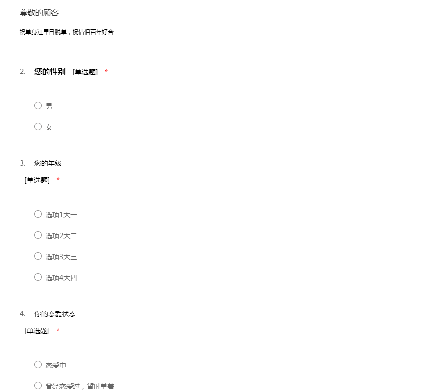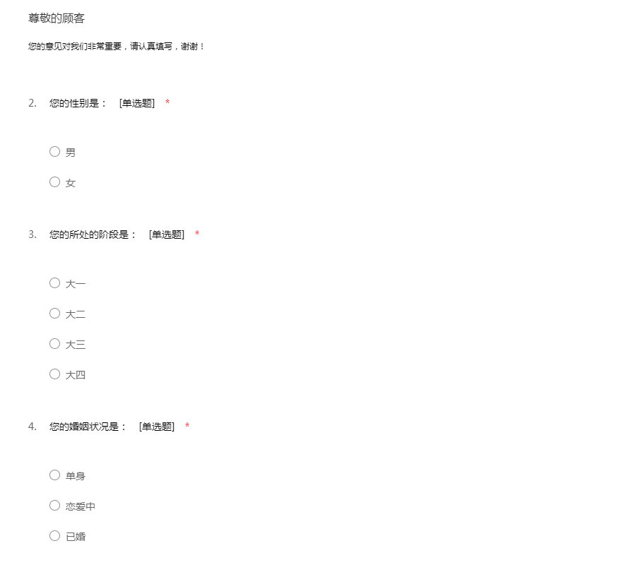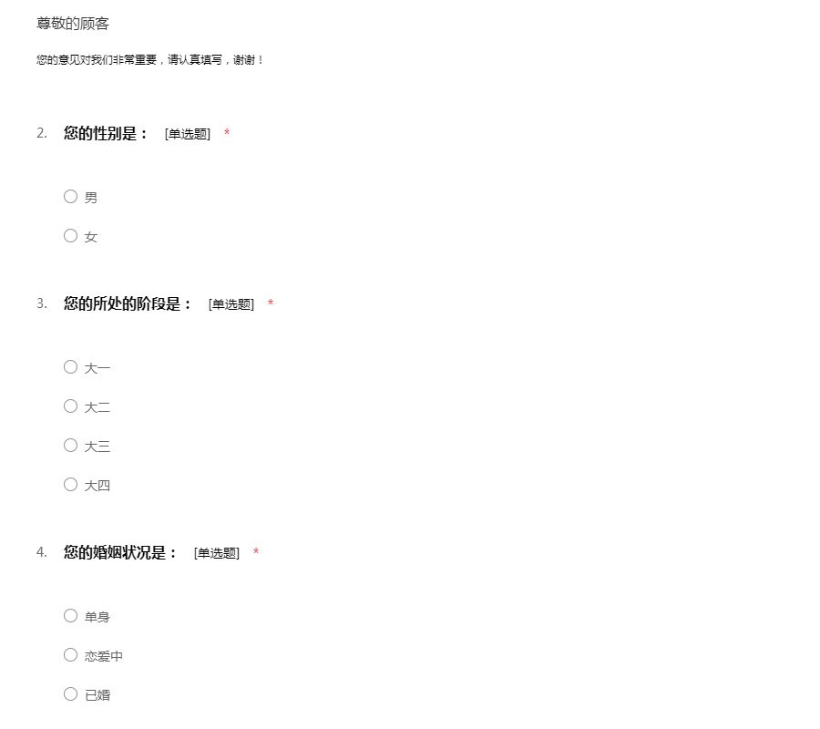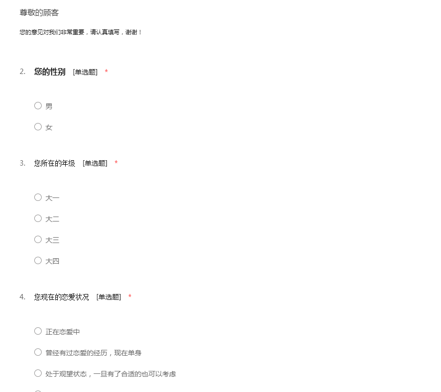 亲爱的同学们:你们好!我们通过一些调查研究了解到,大学时期的婚恋观可以深刻影响人的一生的恋爱和婚姻;然而,因为我们年龄尚浅,涉世不深,缺乏深入了解以及正确判断一个人的经验,所以,在大学阶段及早树立正确的婚恋观非常关键。针对上述实情,我们特意做了这份调查问卷,了解大学生的恋爱问题以及影响因素。本调查采取匿名制,只会耽误您几分钟时间,请根据实情认真填写,非常感谢您的支持与配合!