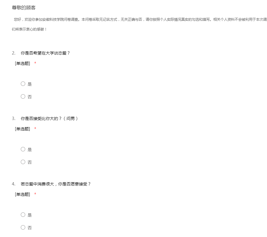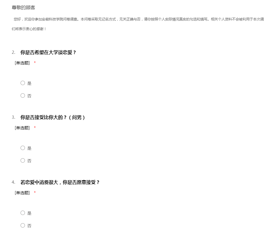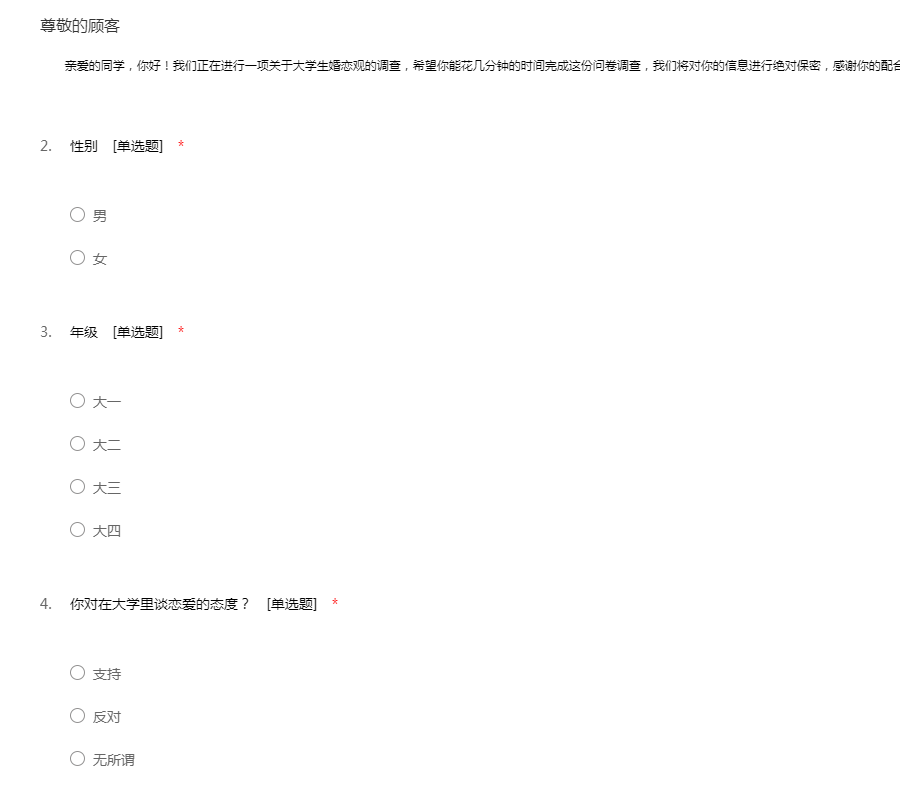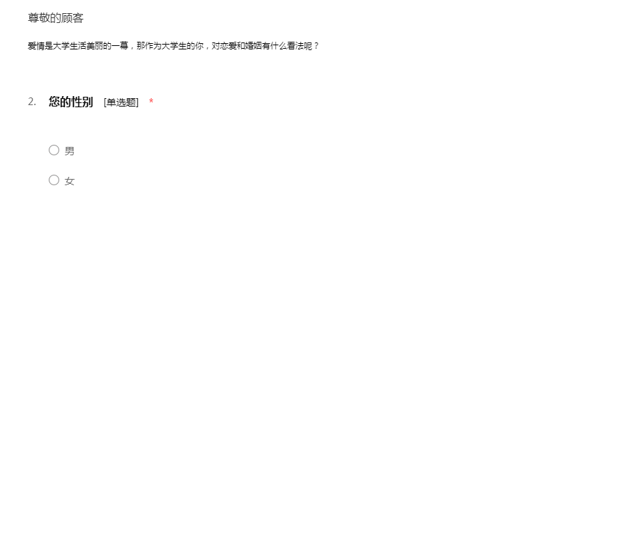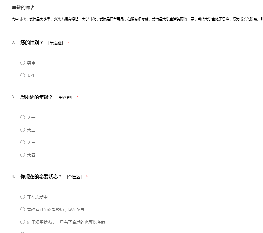 首先,请原谅我们占用了您的宝贵时间。我们为了解大学生的婚恋观,做出此调查。本次调查采用匿名制,请根据您的实际想法认真填写,希望大家能够支持,谢谢!