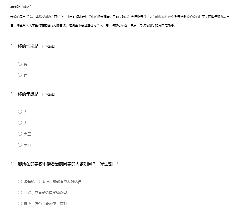 亲爱的同学:首先,非常感谢您在百忙之中抽出时间来参加我们的问卷调查。目前,随着社会日渐开放,人们也从谈性色变到开始敢谈论议论性了,而鉴于现代大学生婚前性行为现象发生较多,我们设立一份问卷,调查当代大学生对婚前性行为的看法。这调查不会泄露任何个人信息,请放心填选。最后,再次感谢您的合作与支持。