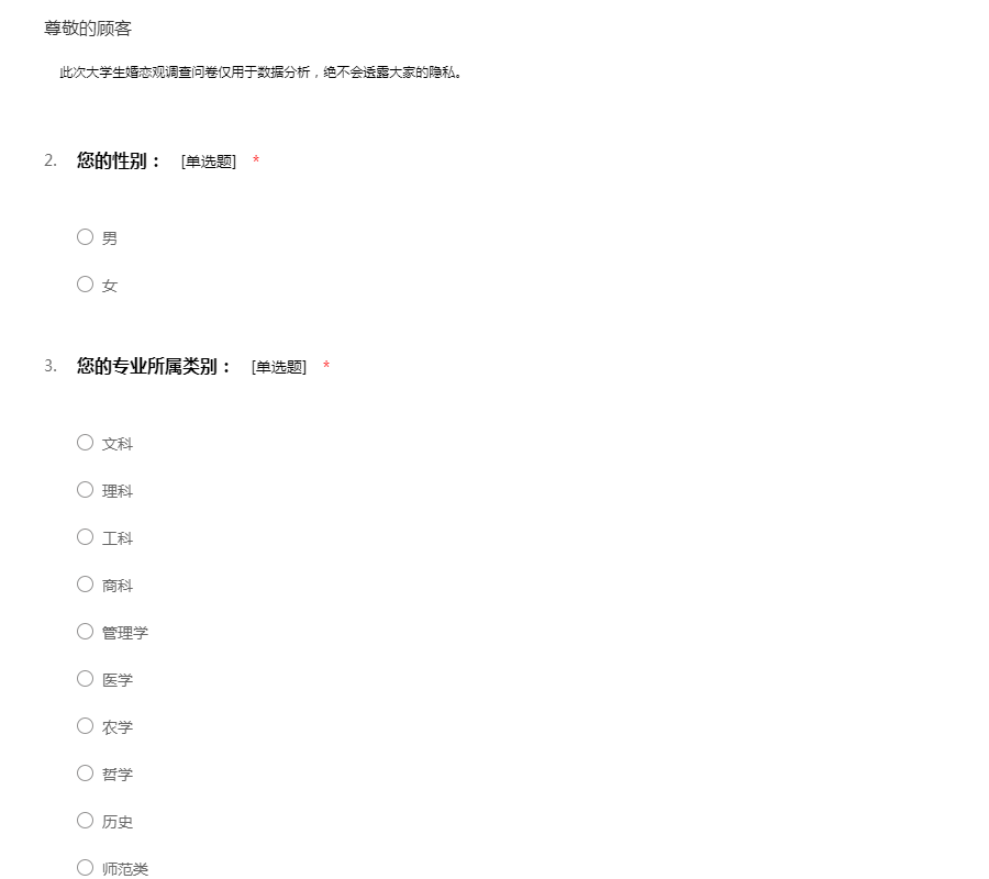 亲爱的同学们:你们好!我们通过一些调查研究了解到,大学时期的婚恋观可以深刻影响人的一生的恋爱和婚姻;然而,因为我们年龄尚浅,涉世不深,缺乏深入了解以及正确判断一个人的经验,所以,在大学阶段及早树立正确的婚恋观非常关键。针对上述实情,我们特意做了这份调查问卷,了解大学生的恋爱问题以及影响因素。本调查采取匿名制,只会耽误您几分钟时间,请根据实情认真填写,非常感谢您的支持与配合!