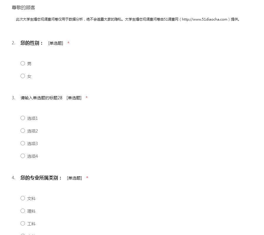 此次大学生婚恋观调查问卷仅用于数据分析,绝不会透露大家的隐私。大学生婚恋观调查问卷由51调查网(http://www.51diaocha.com)提供。