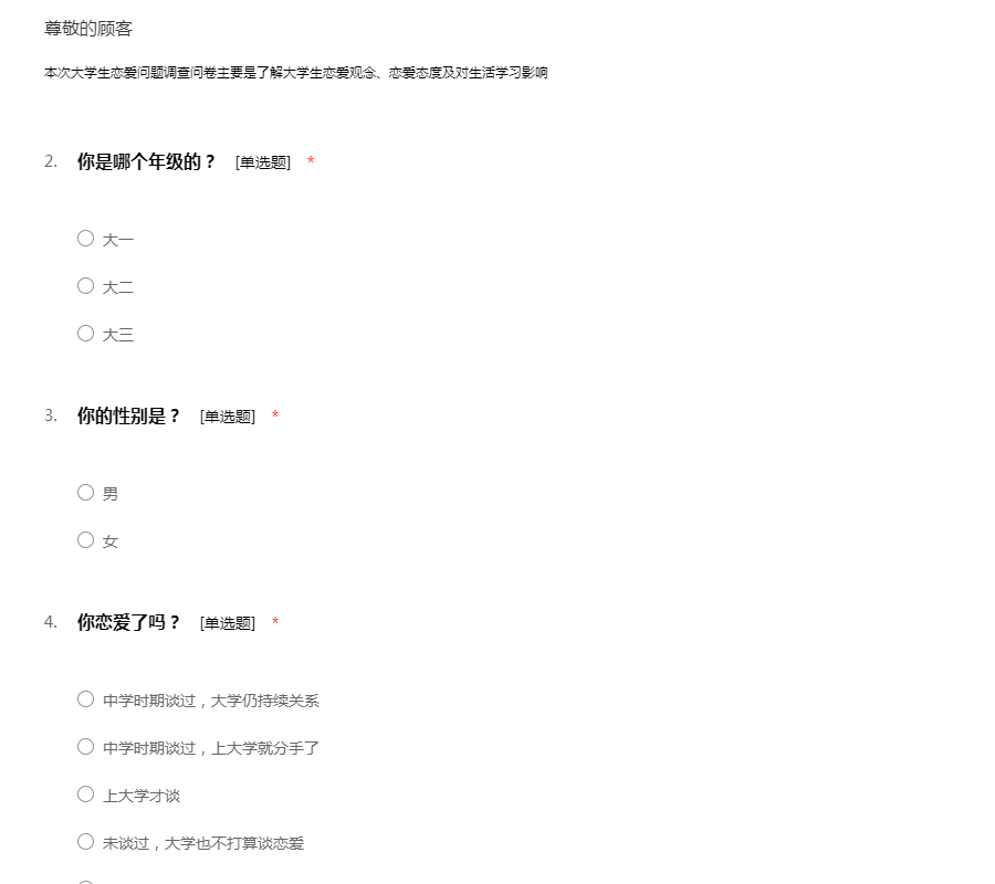 本次大学生恋爱问题调查问卷主要是了解大学生恋爱观念、恋爱态度及对生活学习影响