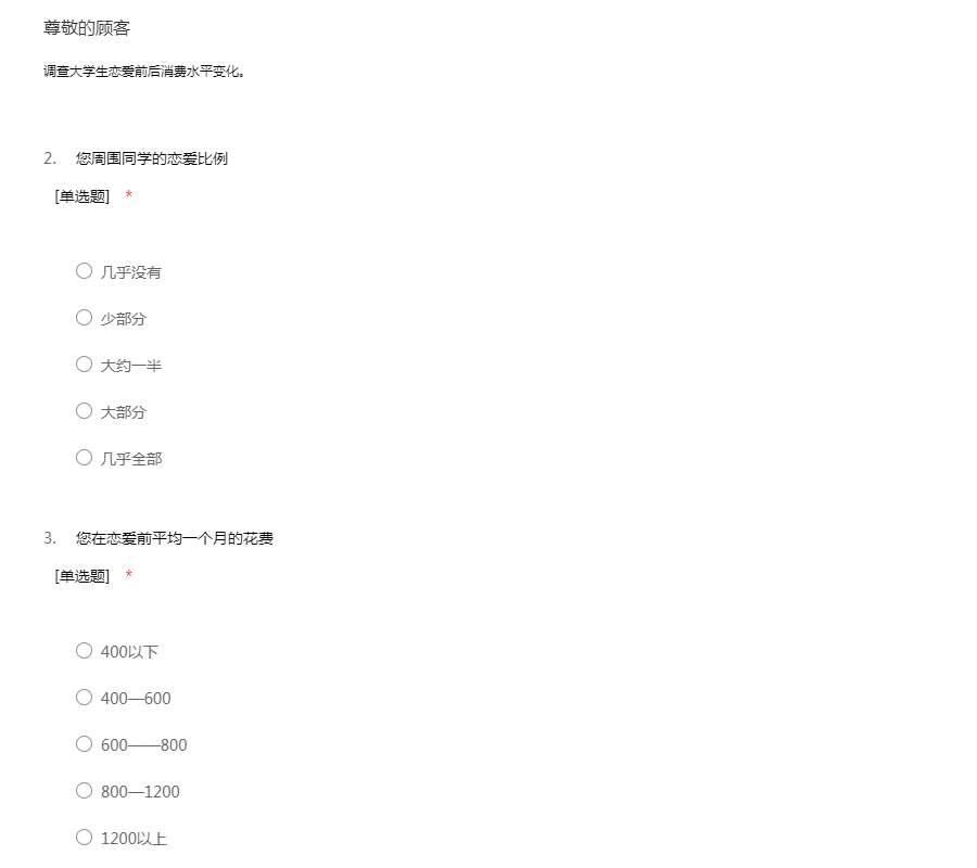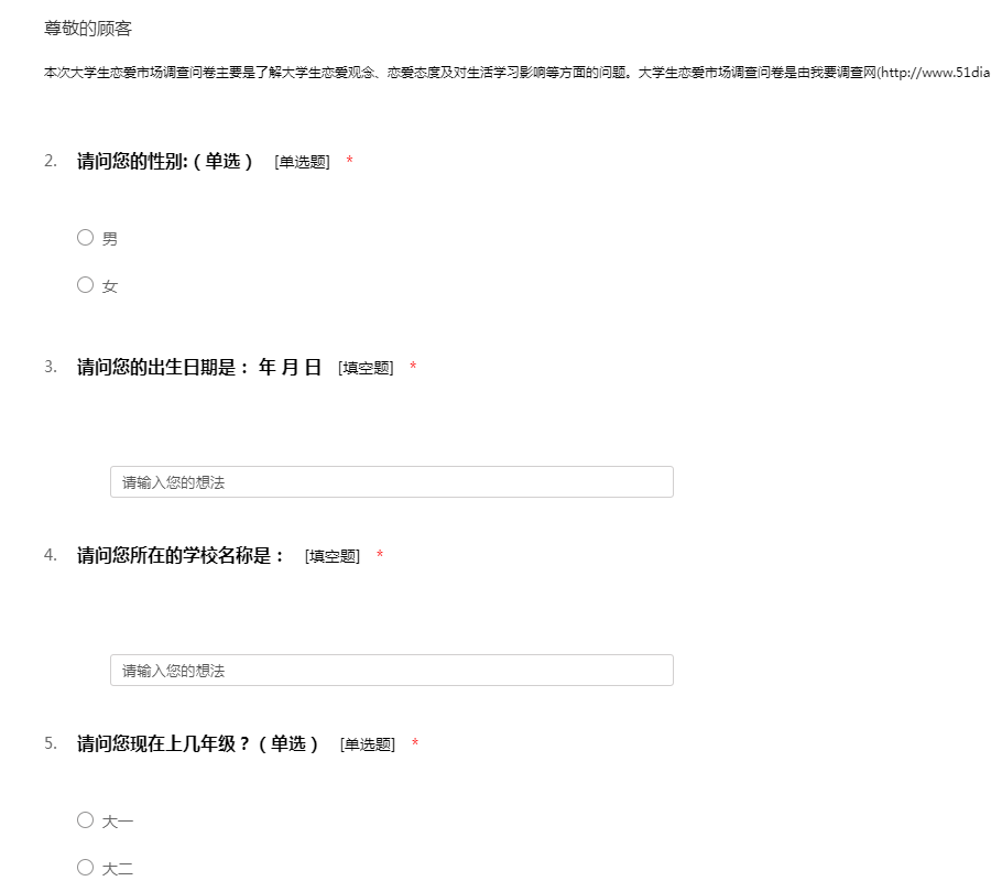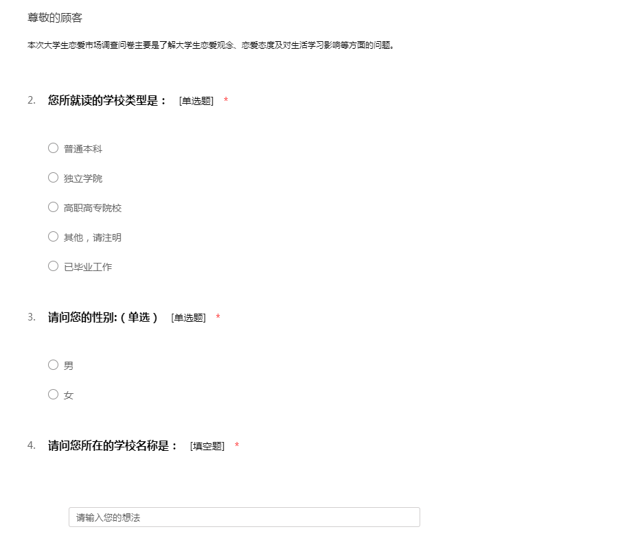 本次大学生恋爱市场调查问卷主要是了解大学生恋爱观念、恋爱态度及对生活学习影响等方面的问题。