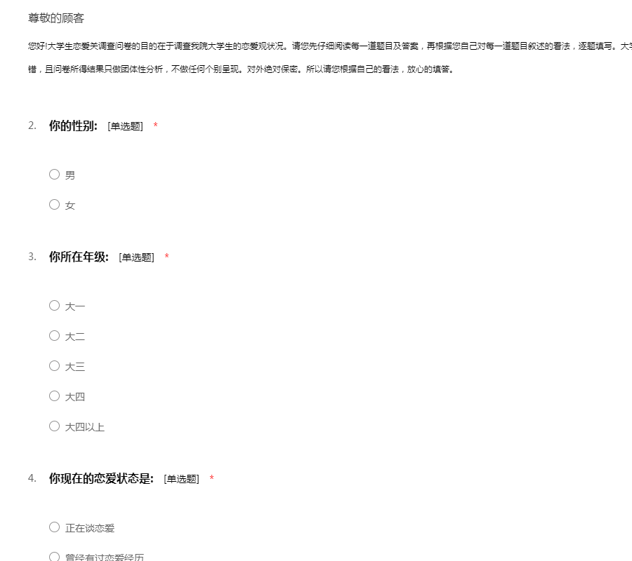 您好!大学生恋爱关调查问卷的目的在于调查我院大学生的恋爱观状况。请您先仔细阅读每一道题目及答案,再根据您自己对每一道题目叙述的看法,逐题填写。大学生恋爱关调查问卷的各项答案无所谓好坏对错,且问卷所得结果只做团体性分析,不做任何个别呈现。对外绝对保密。所以请您根据自己的看法,放心的填答。