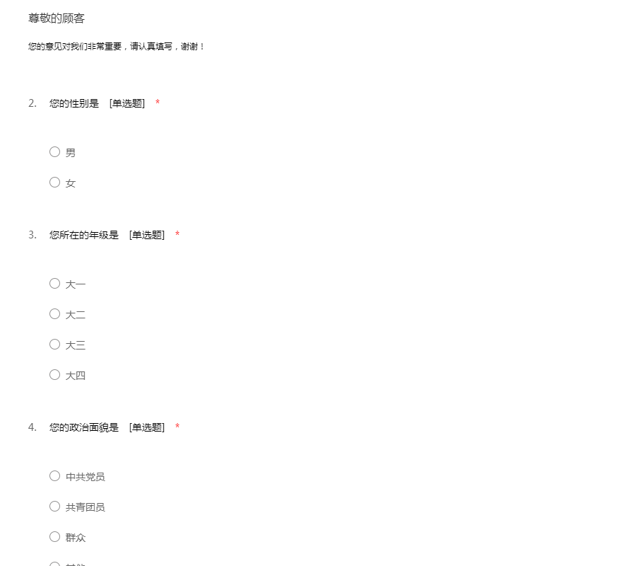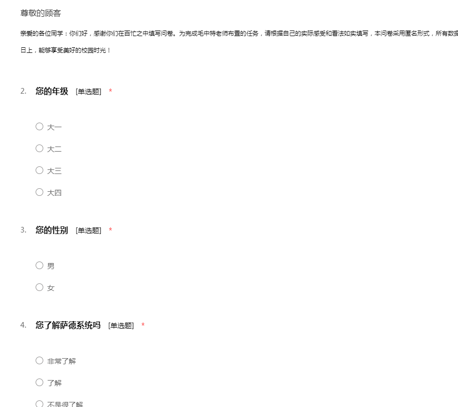 亲爱的各位同学:你们好,感谢你们在百忙之中填写问卷。为完成毛中特老师布置的任务,请根据自己的实际感受和看法如实填写,本问卷采用匿名形式,所有数据仅供调查研究分析使用。希望各位同学学业蒸蒸日上,能够享受美好的校园时光!