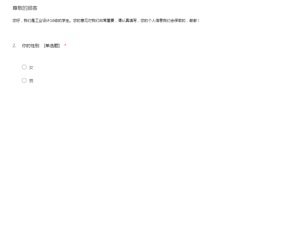 您好,我们是工业设计16级的学生。您的意见对我们非常重要,请认真填写,您的个人信息我们会保密的,谢谢!