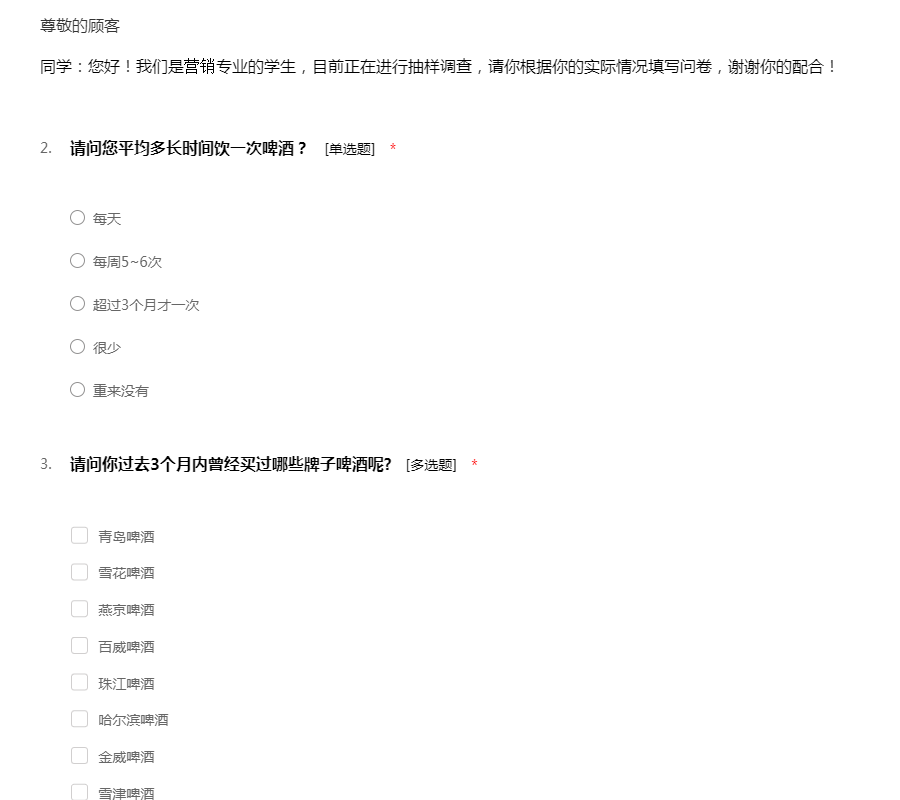 同学:您好!我们是营销专业的学生,目前正在进行抽样调查,请你根据你的实际情况填写问卷,谢谢你的配合!