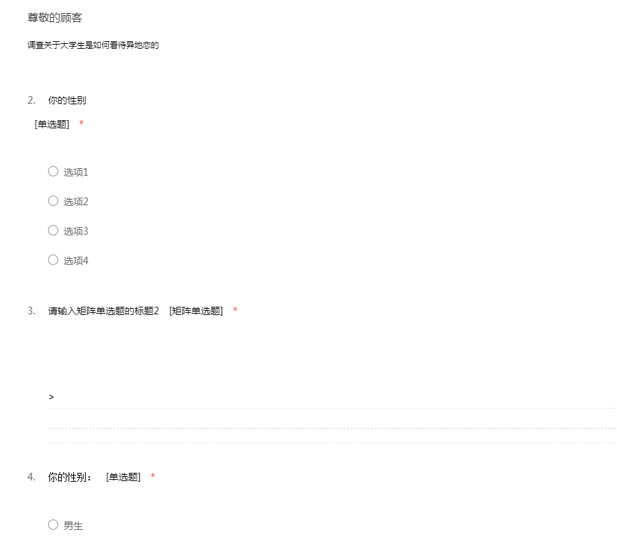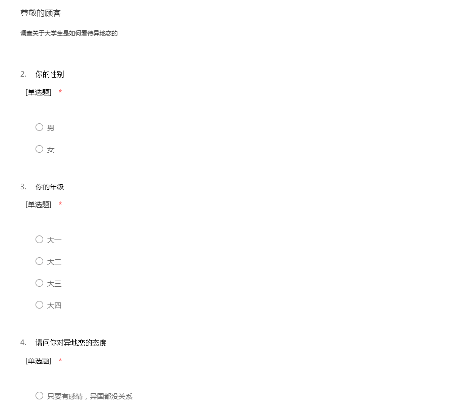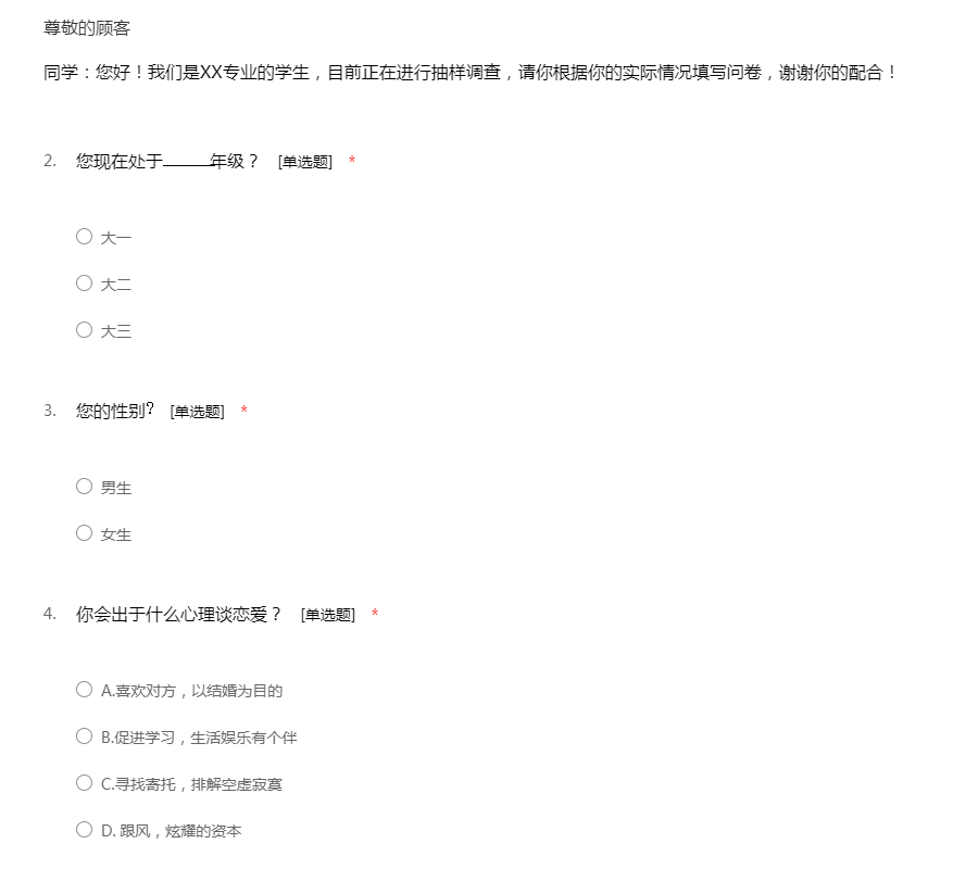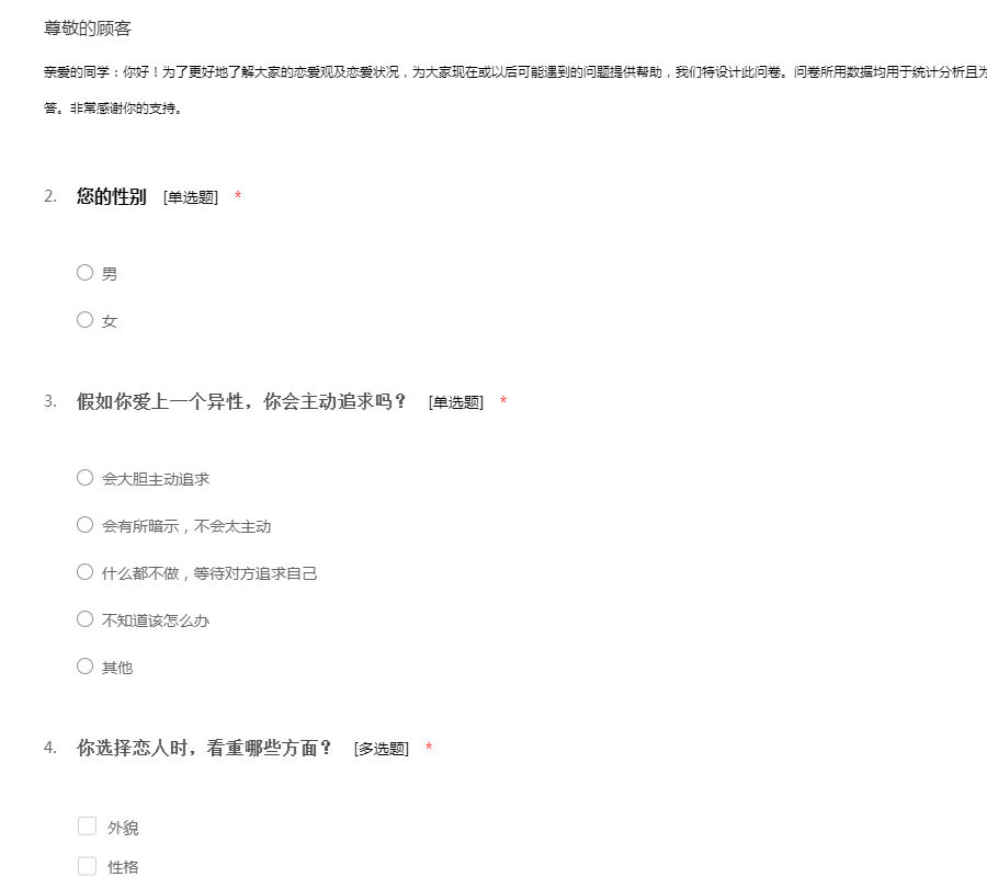 亲爱的同学:你好!为了更好地了解大家的恋爱观及恋爱状况,为大家现在或以后可能遇到的问题提供帮助,我们特设计此问卷。问卷所用数据均用于统计分析且为匿名调查,我们会保护你的隐私权,望如实回答。非常感谢你的支持。