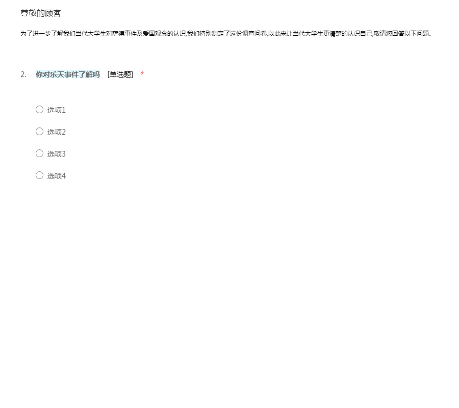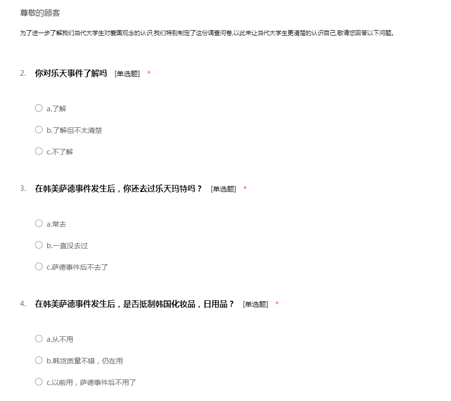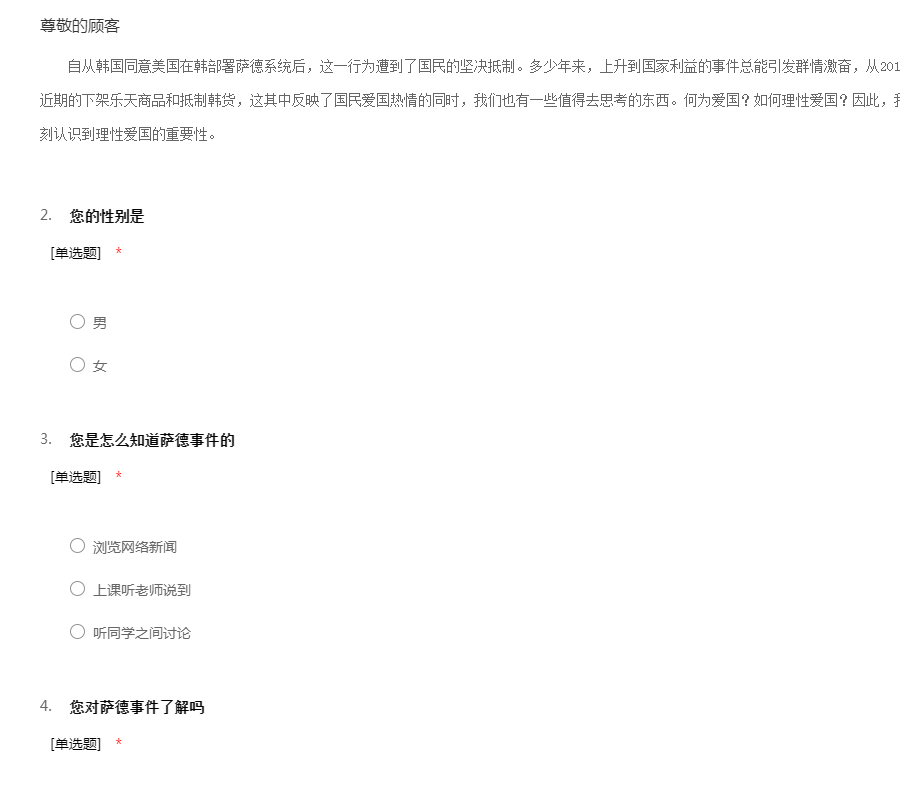 为了进一步了解我们当代大学生对萨德事件及爱国观念的认识,我们特别制定了这份调查问卷,以此来让当代大学生更清楚的认识自己,敬请您回答以下问题。