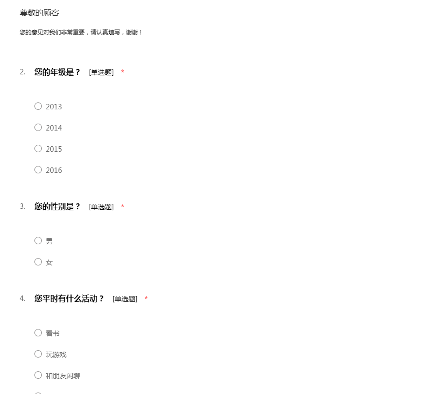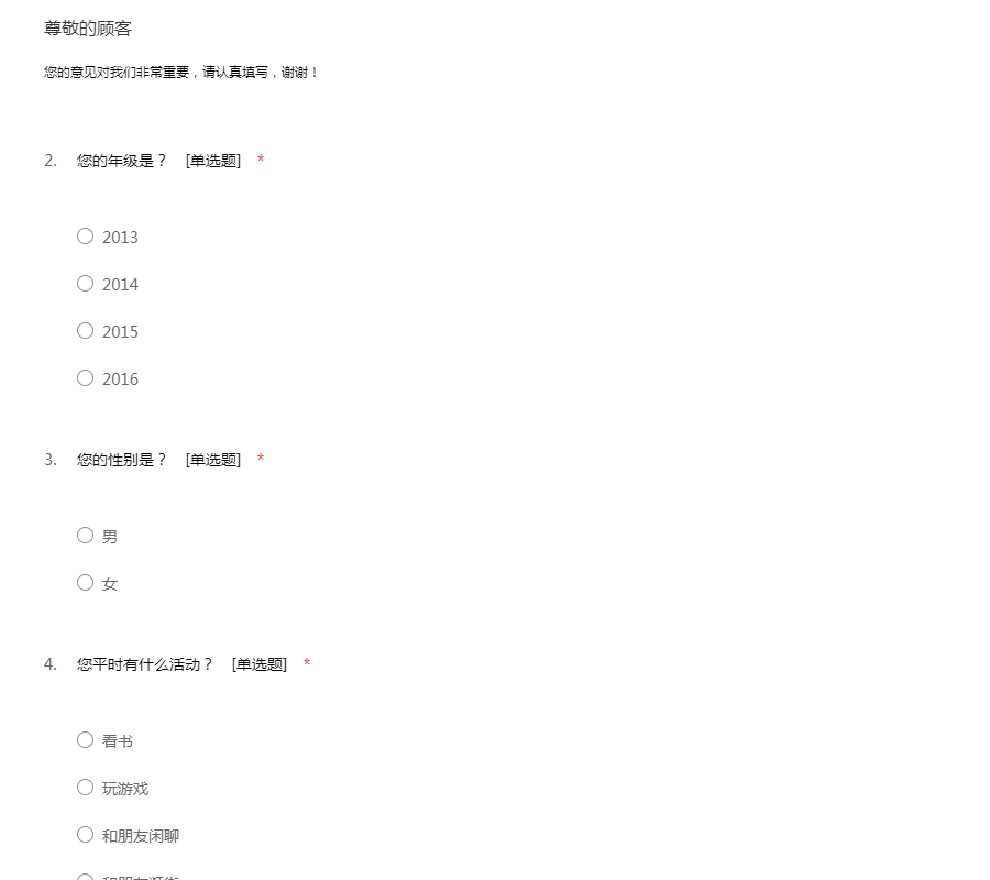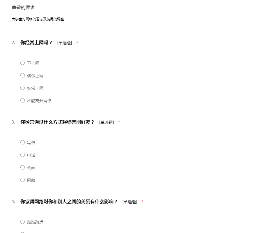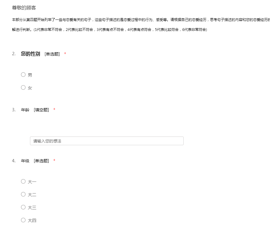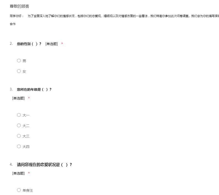 亲爱的同学:你好!为了更好地了解大家的恋爱观及恋爱状况,为大家现在或以后可能遇到的问题提供帮助,我们特设计此问卷。问卷所用数据均用于统计分析且为匿名调查,我们会保护你的隐私权,望如实回答。非常感谢你的支持。
