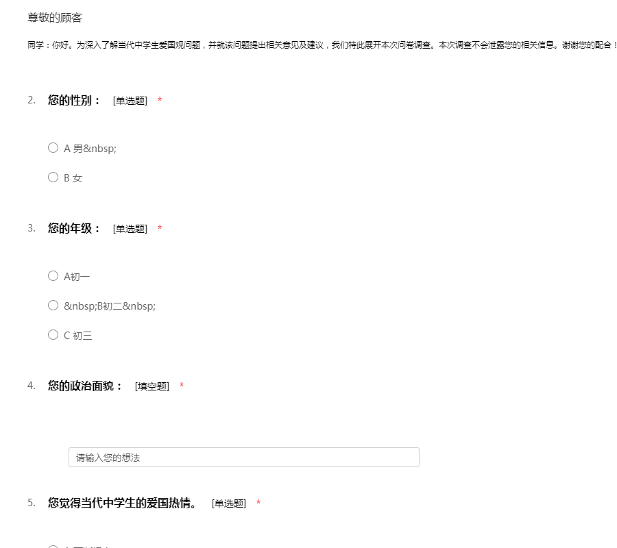 同学:你好。为深入了解当代中学生爱国观问题,并就该问题提出相关意见及建议,我们特此展开本次问卷调查。本次调查不会泄露您的相关信息。谢谢您的配合!一基本信息