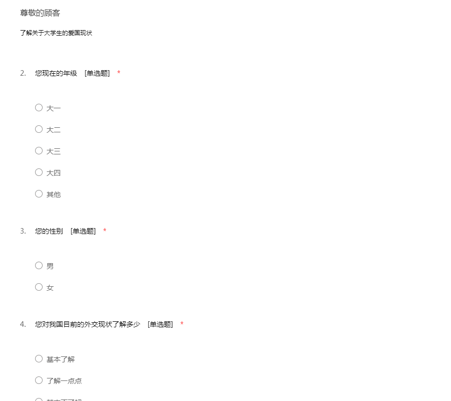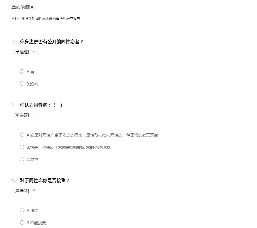 亲爱的同学:你好!为了更好地了解大家对于同性恋的认识,为大家现在或以后可能遇到的问题提供帮助,我们特设计此问卷。问卷所用数据均用于统计分析且为匿名调查,我们会保护你的隐私权,望如实回答。非常感谢你的支持。