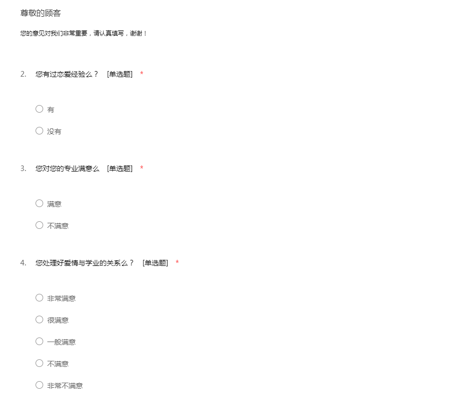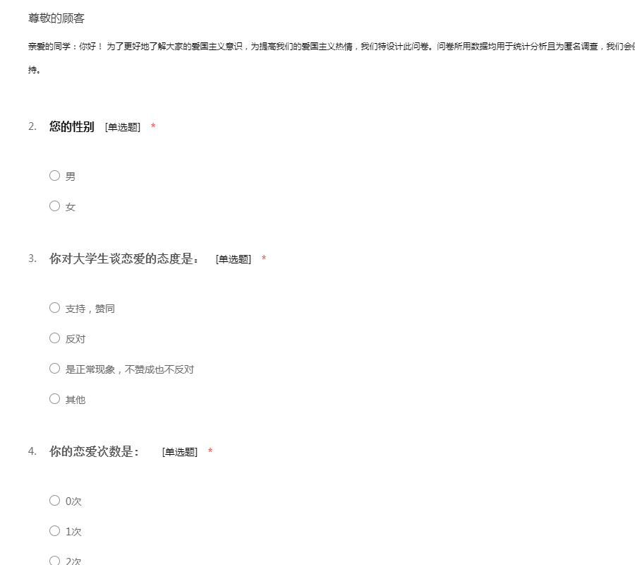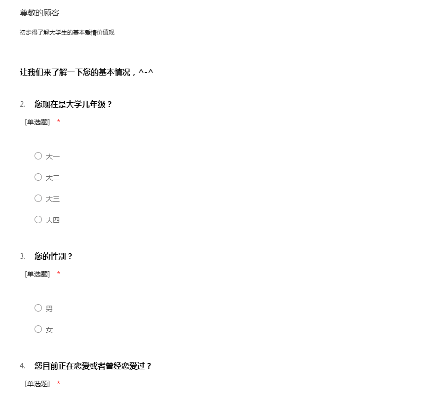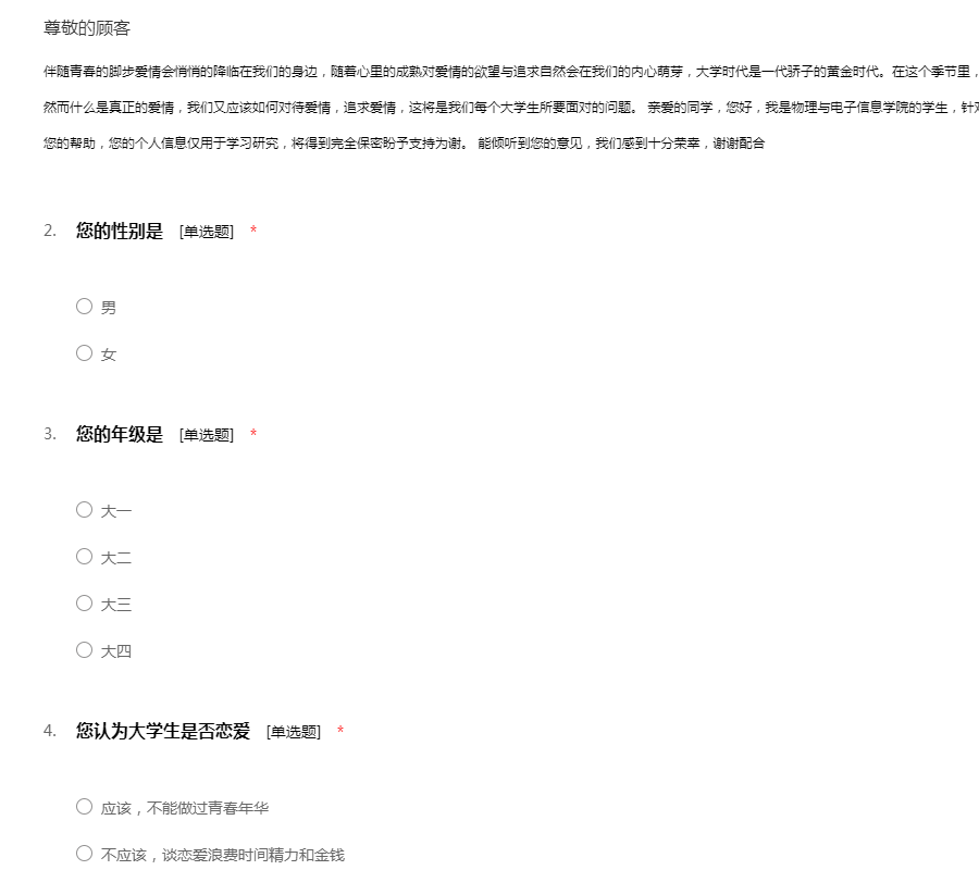 亲爱的同学,您好,我是物理与电子信息学院的学生,针对大学生感情这一课题进行调查分析,希望得到您的帮助,您的个人信息仅用于学习研究,将得到完全保密盼予支持为谢。