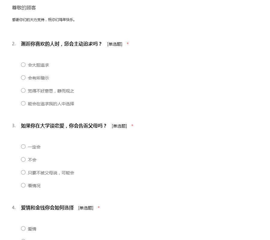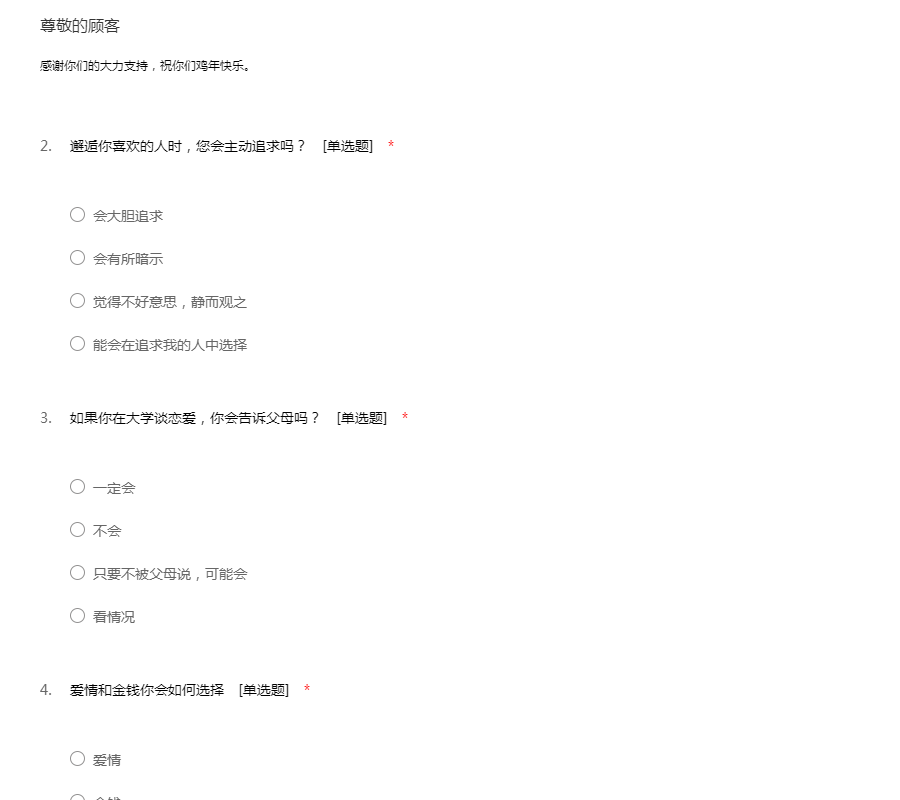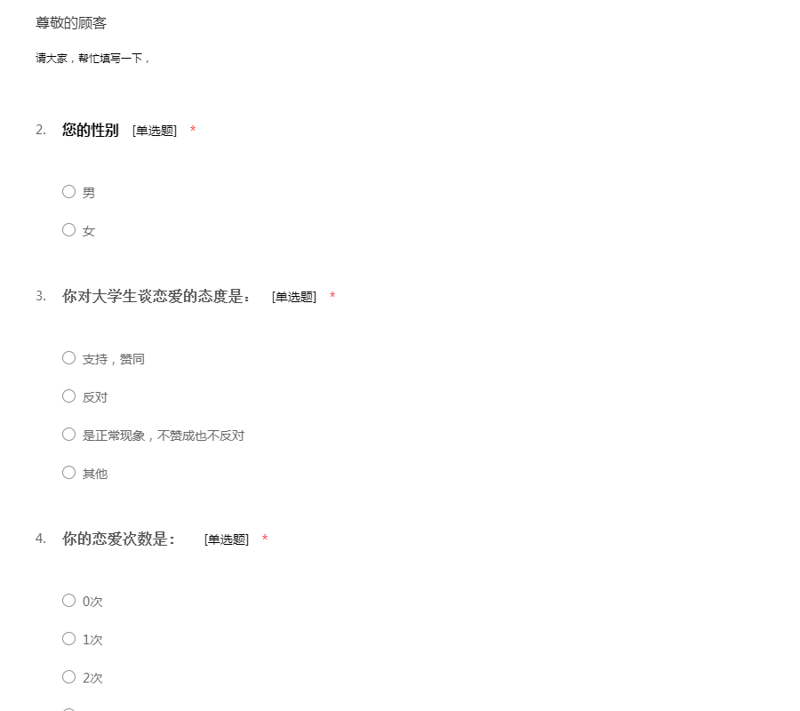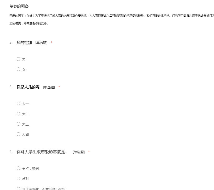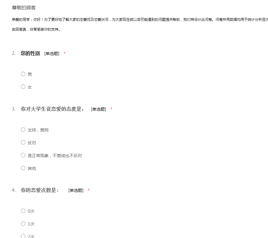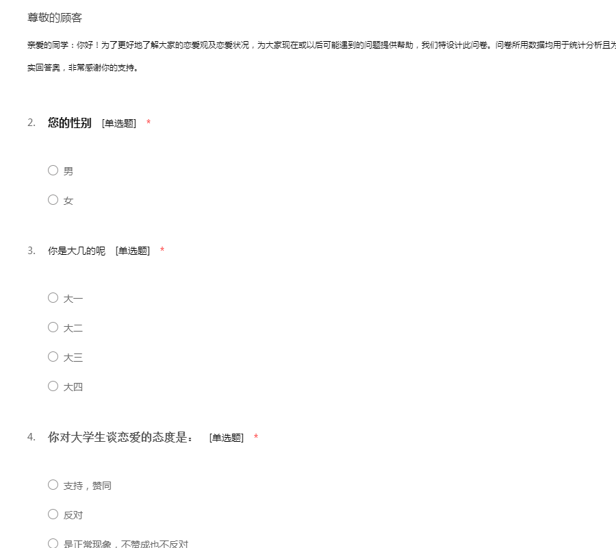 亲爱的同学:你好!为了更好地了解大家的恋爱观及恋爱状况,为大家现在或以后可能遇到的问题提供帮助,我们特设计此问卷。问卷所用数据均用于统计分析且为匿名调查,我们会保护你的隐私权,望如实回答。非常感谢你的支持。