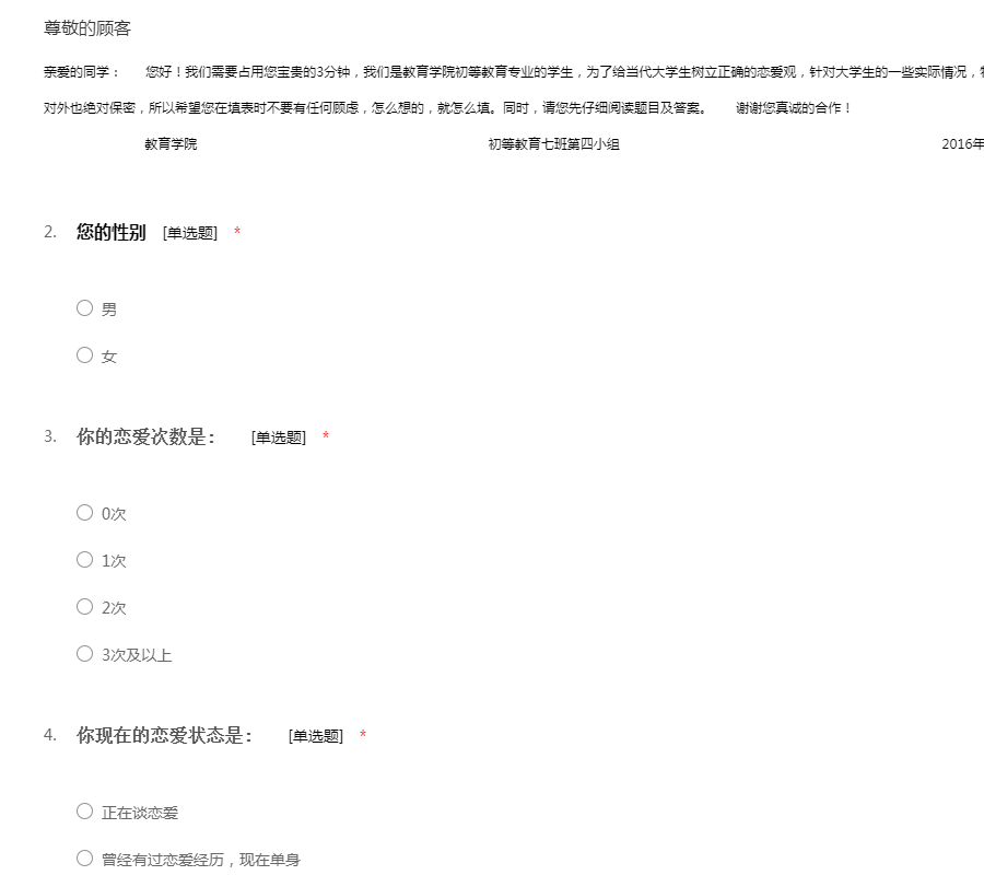 亲爱的同学: 您好!我们需要占用您宝贵的3分钟,我们是教育学院初等教育专业的学生,为了给当代大学生树立正确的恋爱观,针对大学生的一些实际情况,特意做此次调查。本问卷是采取不记名的方式,对外也绝对保密,所以希望您在填表时不要有任何顾虑,怎么想的,就怎么填。同时,请您先仔细阅读题目及答案。 谢谢您真诚的合作! 教育学院 初等教育七班第四小组 2016年11月