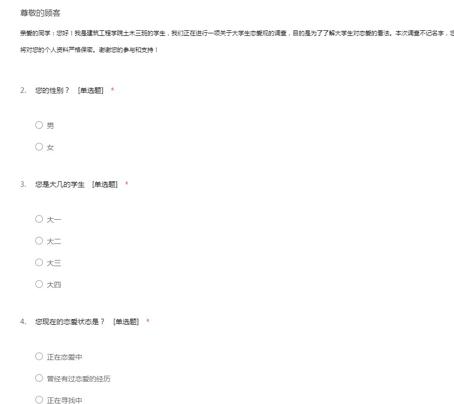 亲爱的同学:您好!我是建筑工程学院土木三班的学生,我们正在进行一项关于大学生恋爱观的调查,目的是为了了解大学生对恋爱的看法。本次调查不记名字,您的调查无所谓对错,只需要如实反映情况,我们将对您的个人资料严格保密。谢谢您的参与和支持!