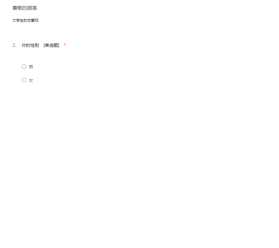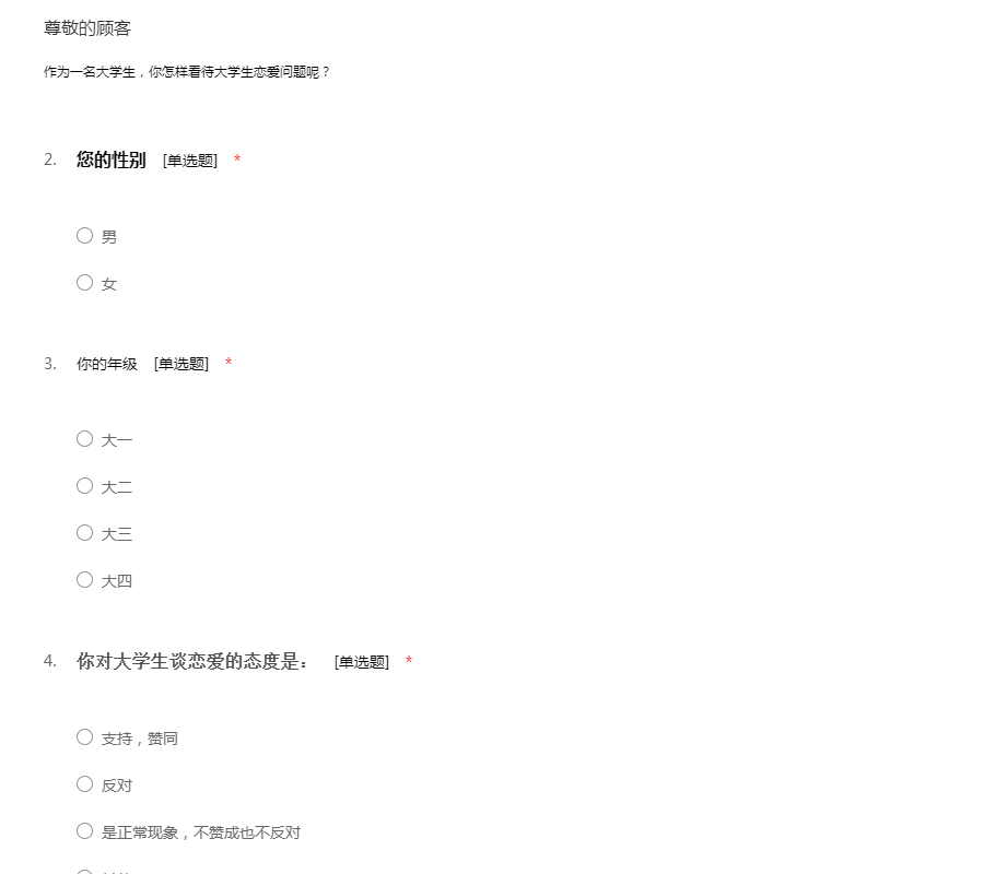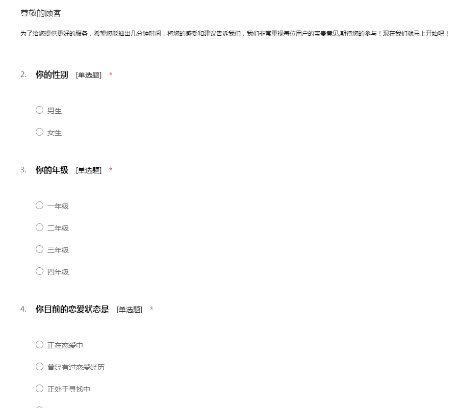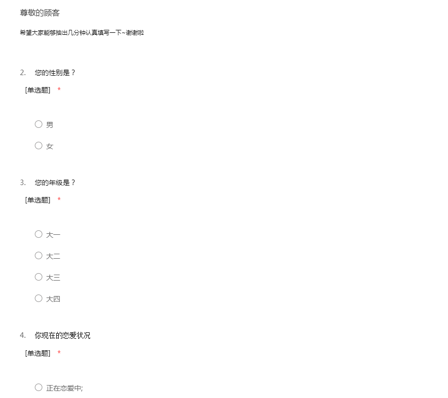 亲爱的同学:你好!为了更好地了解大家的恋爱观及恋爱状况,为大家现在或以后可能遇到的问题提供帮助,我们特设计此问卷。问卷所用数据均用于统计分析且为匿名调查,我们会保护你的隐私权,望如实回答。非常感谢你的支持。