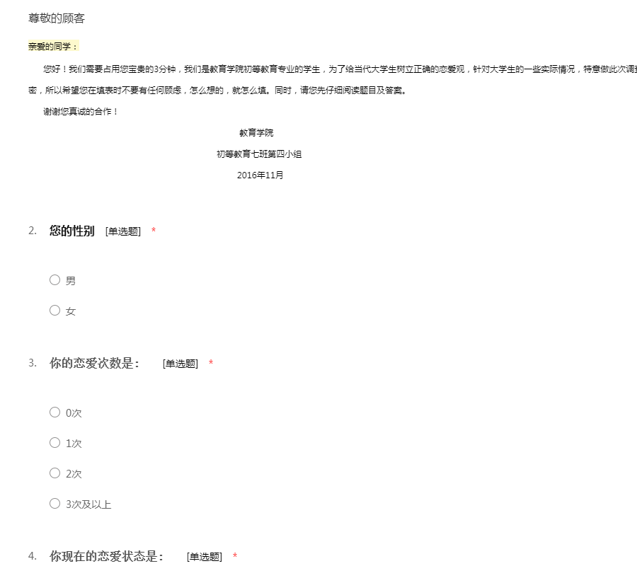 亲爱的同学: 您好!我们需要占用您宝贵的3分钟,我们是教育学院初等教育专业的学生,为了给当代大学生树立正确的恋爱观,针对大学生的一些实际情况,特意做此次调查。本问卷是采取不记名的方式,对外也绝对保密,所以希望您在填表时不要有任何顾虑,怎么想的,就怎么填。同时,请您先仔细阅读题目及答案。 谢谢您真诚的合作! 教育学院 初等教育七班第四小组 2016年11月