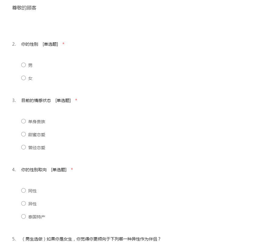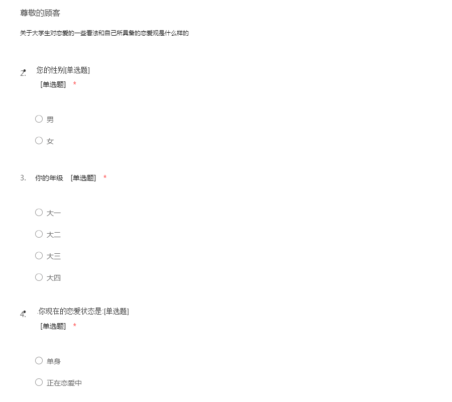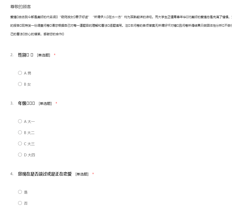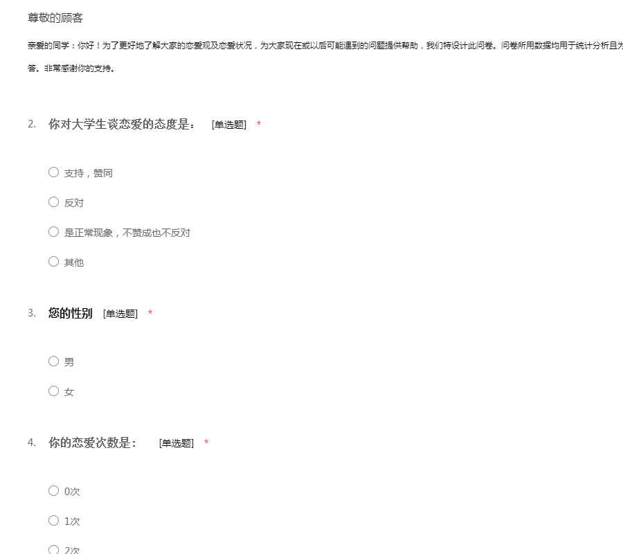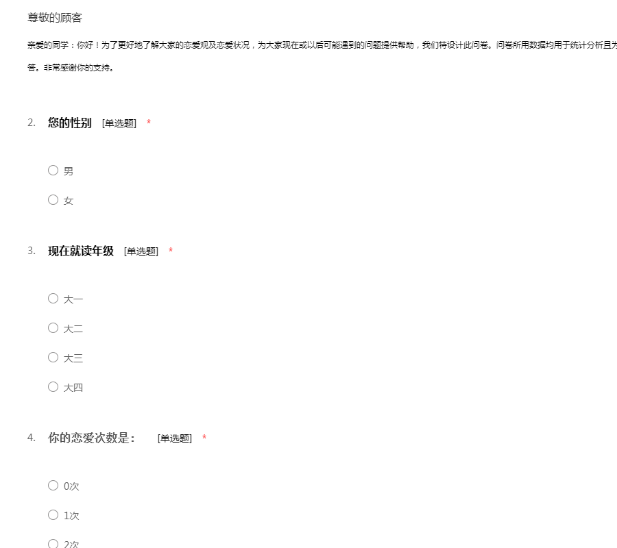 亲爱的同学:你好!为了更好地了解大家的恋爱观及恋爱状况,为大家现在或以后可能遇到的问题提供帮助,我们特设计此问卷。问卷所用数据均用于统计分析且为匿名调查,我们会保护你的隐私权,望如实回答。非常感谢你的支持。