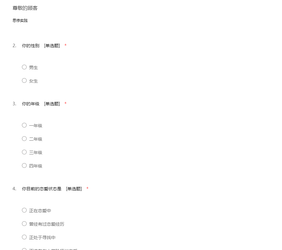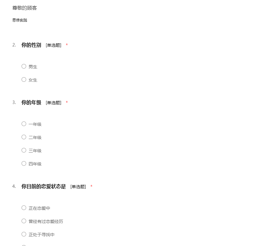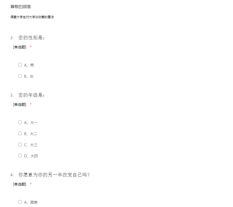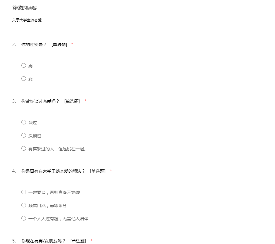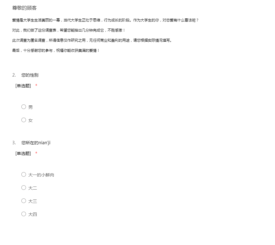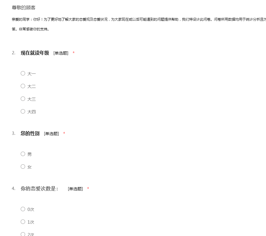 亲爱的同学:你好!为了更好地了解大家的恋爱观及恋爱状况,为大家现在或以后可能遇到的问题提供帮助,我们特设计此问卷。问卷所用数据均用于统计分析且为匿名调查,我们会保护你的隐私权,望如实回答。非常感谢你的支持。