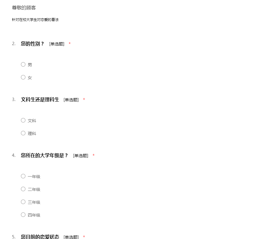 亲爱的同学:你好!为了更好地了解大家的恋爱观及恋爱状况,为大家现在或以后可能遇到的问题提供帮助,我们特设计此问卷。问卷所用数据均用于统计分析且为匿名调查,我们会保护你的隐私权,望如实回答。非常感谢你的支持。