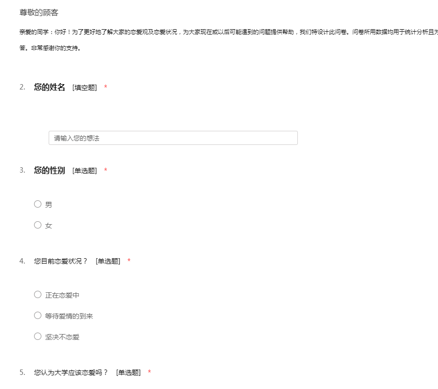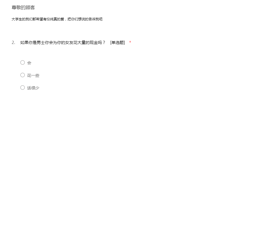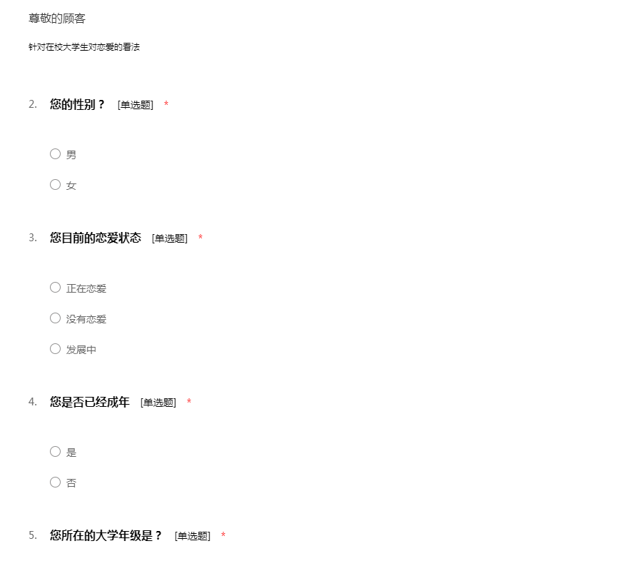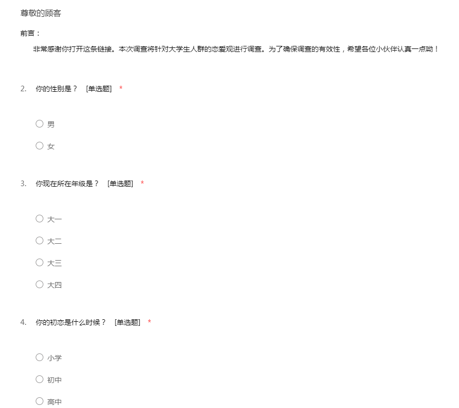 前言: 非常感谢你打开这条链接。本次调查将针对大学生人群的恋爱观进行调查。为了确保调查的有效性,希望各位小伙伴认真一点呦!
