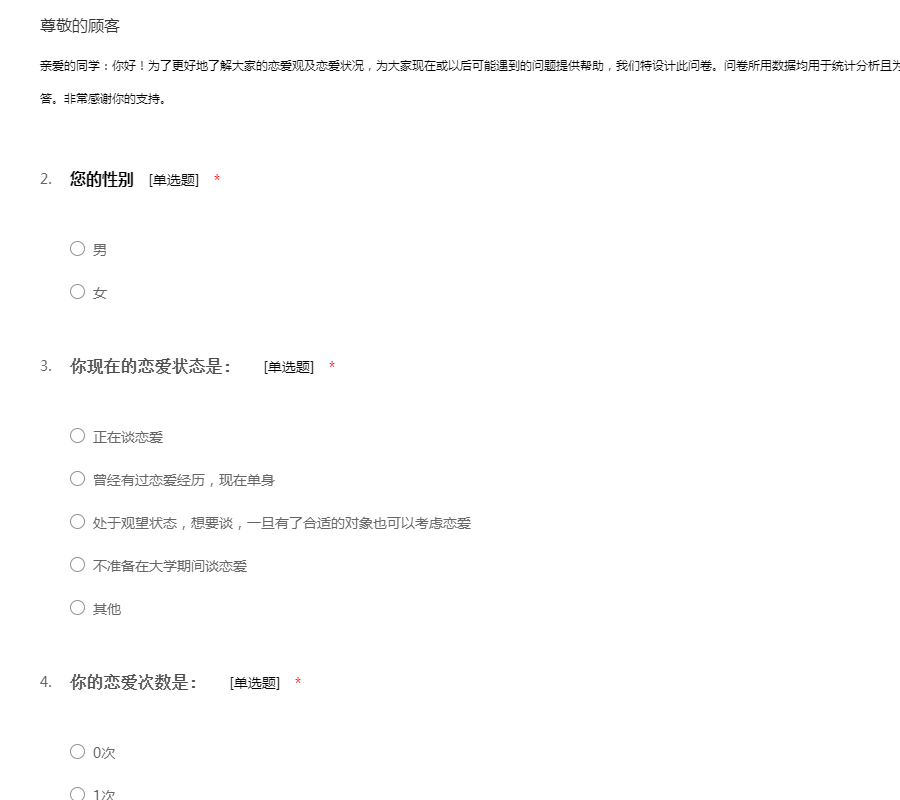 亲爱的同学:你好!为了更好地了解大家的恋爱观及恋爱状况,为大家现在或以后可能遇到的问题提供帮助,我们特设计此问卷。问卷所用数据均用于统计分析且为匿名调查,我们会保护你的隐私权,望如实回答。非常感谢你的支持。