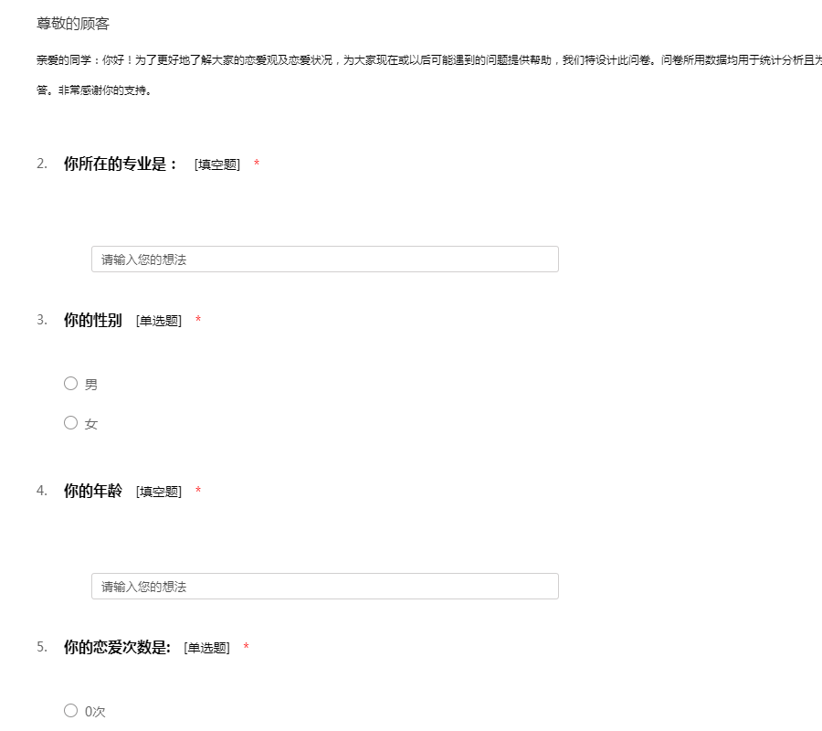 亲爱的同学:你好!为了更好地了解大家的恋爱观及恋爱状况,为大家现在或以后可能遇到的问题提供帮助,我们特设计此问卷。问卷所用数据均用于统计分析且为匿名调查,我们会保护你的隐私权,望如实回答。非常感谢你的支持。